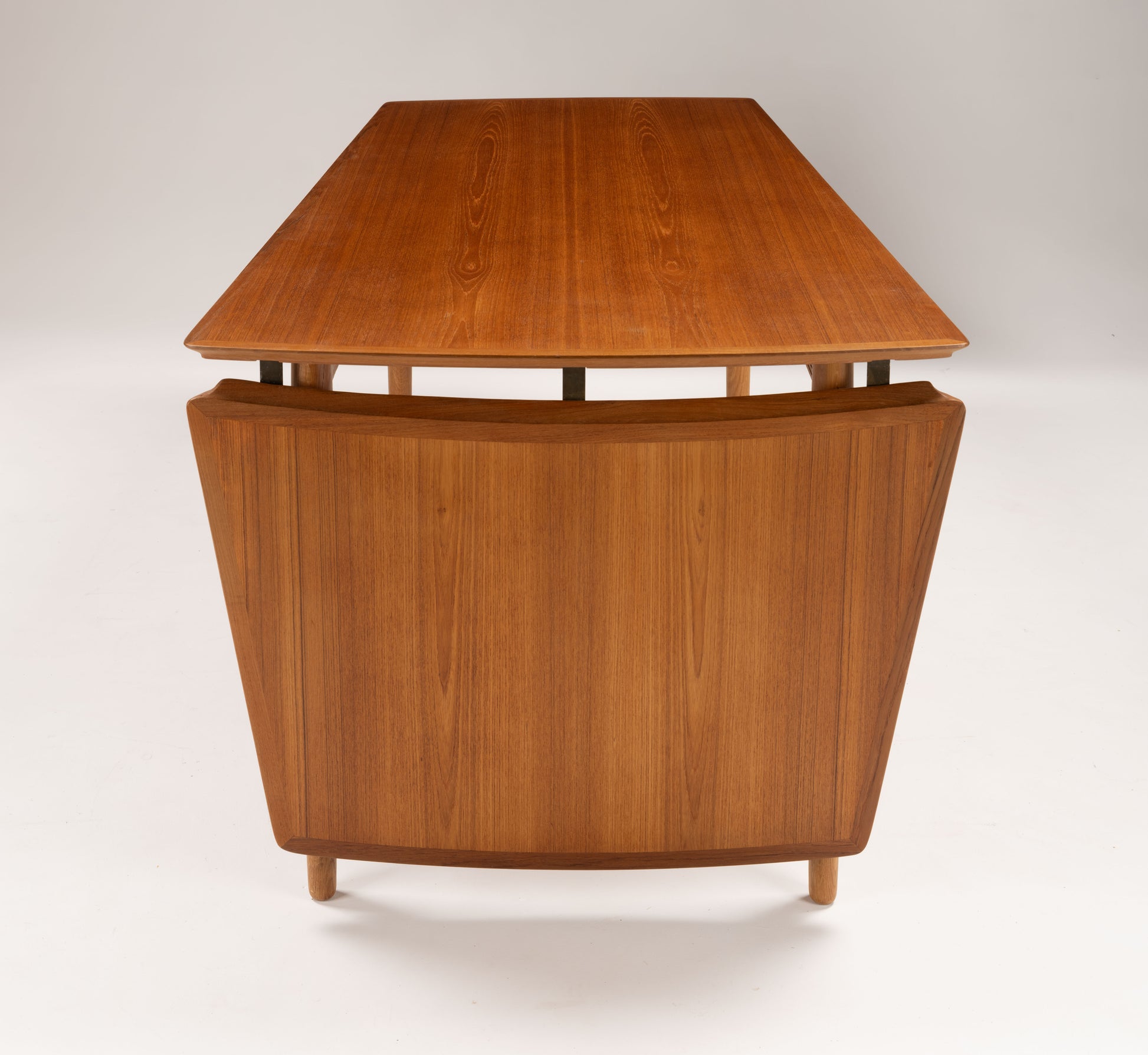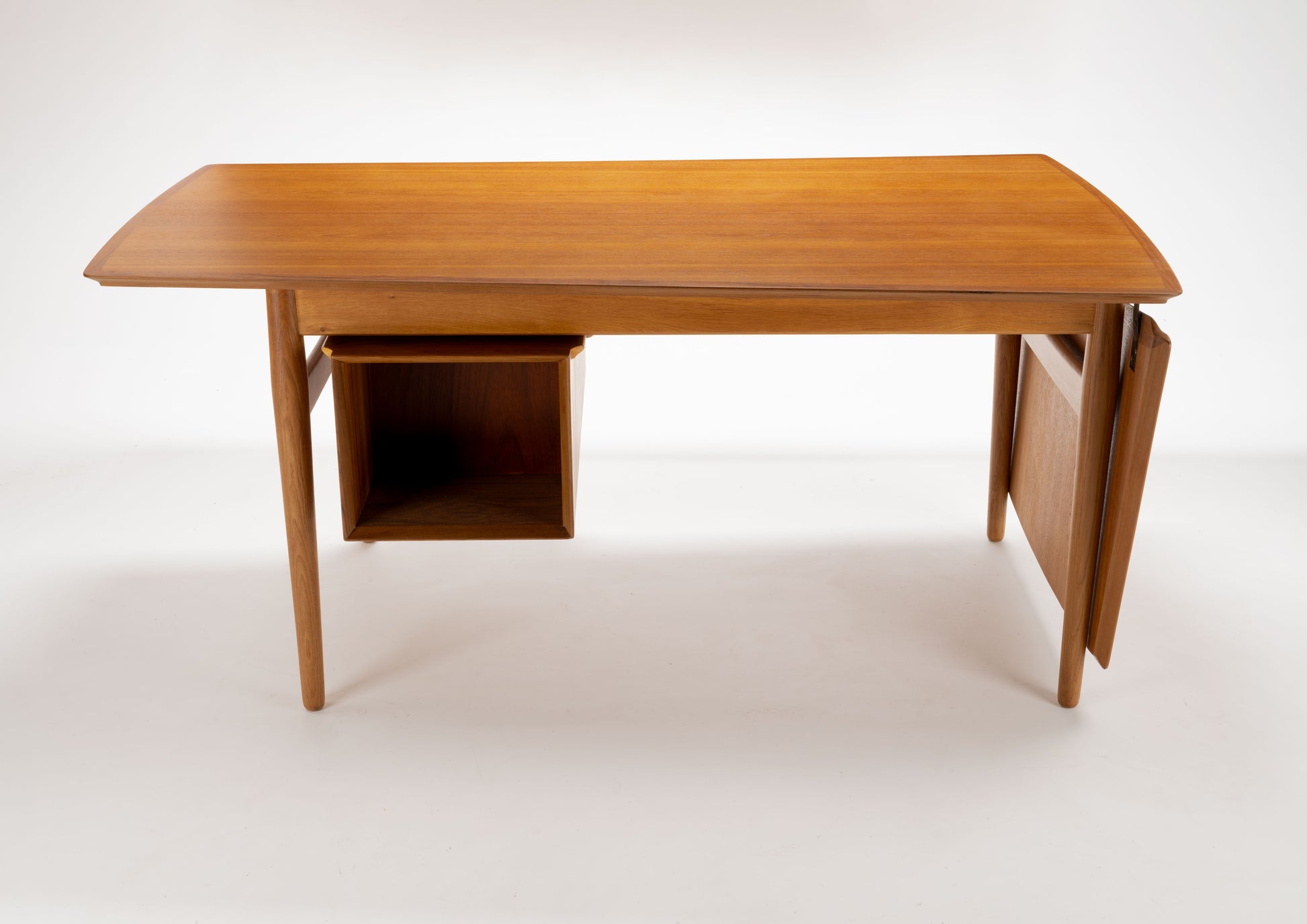 Designed by Arne Vodder in the 1960s, crafted from richly grained teak, features a hinged drop-leaf that extends the workspace from approximately 62 inches to over 85 inches, accommodating various needs from compact writing surfaces to expansive work areas .