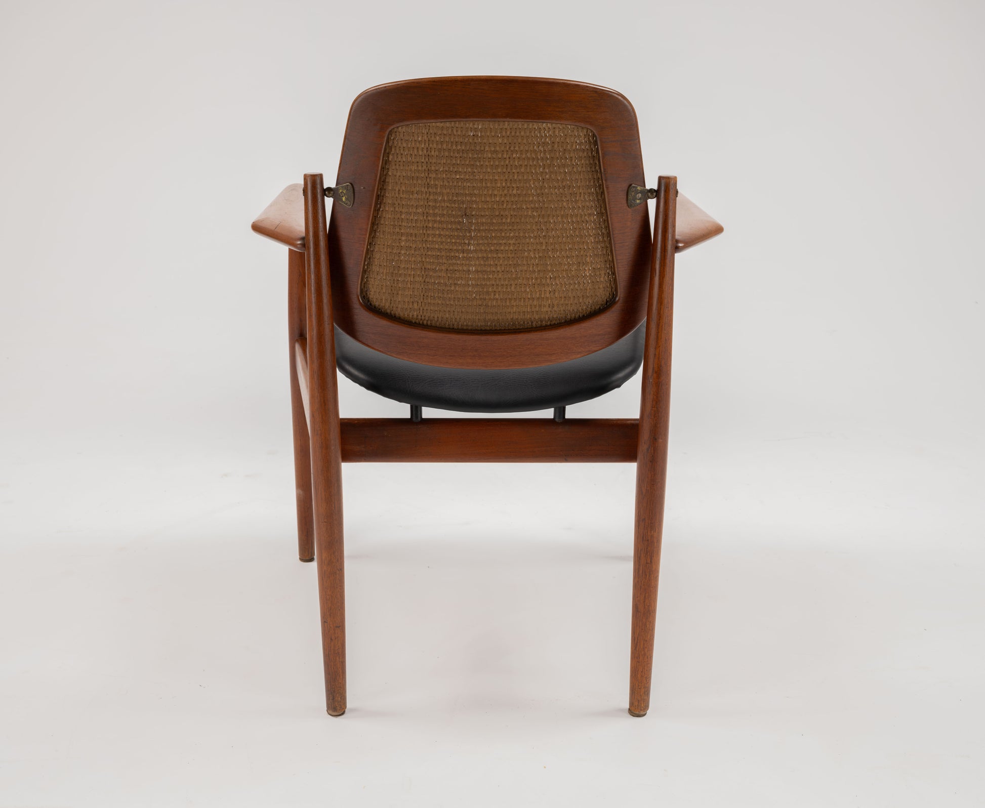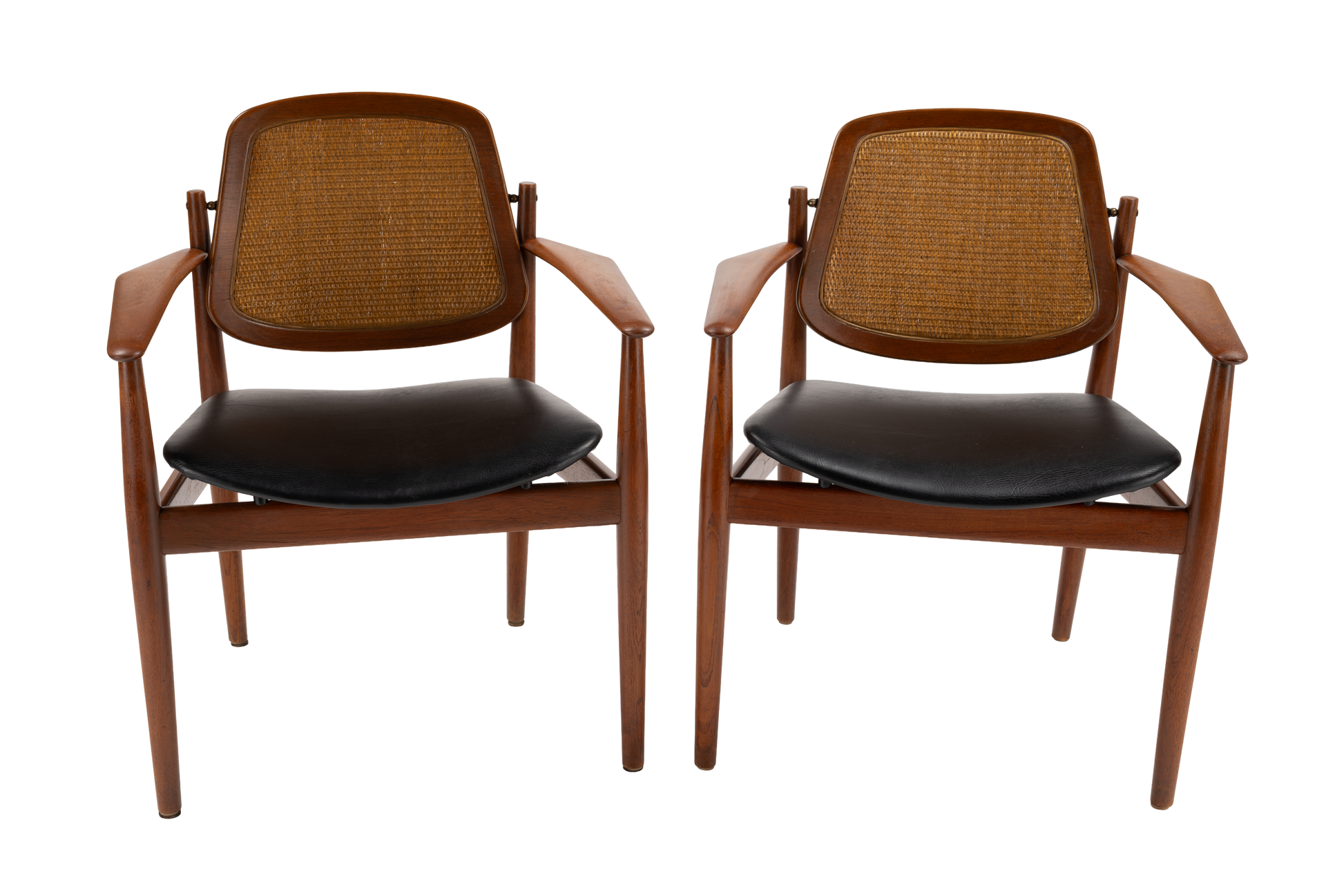The Model 205 & 206 dining chairs, designed by Arne Vodder for France & Daverkosen in the 1950s, feature sculpted frames and hinged backrests mounted with brass fittings, allowing the backrests to adjust as you lean back, enhancing comfort. The set includes pairs of both armchairs and side chairs - each armchair distinguished by gracefully curved, paddle-style arms that echo the organic lines of the frame, offering additional support without compromising the chair’s sleek profile.