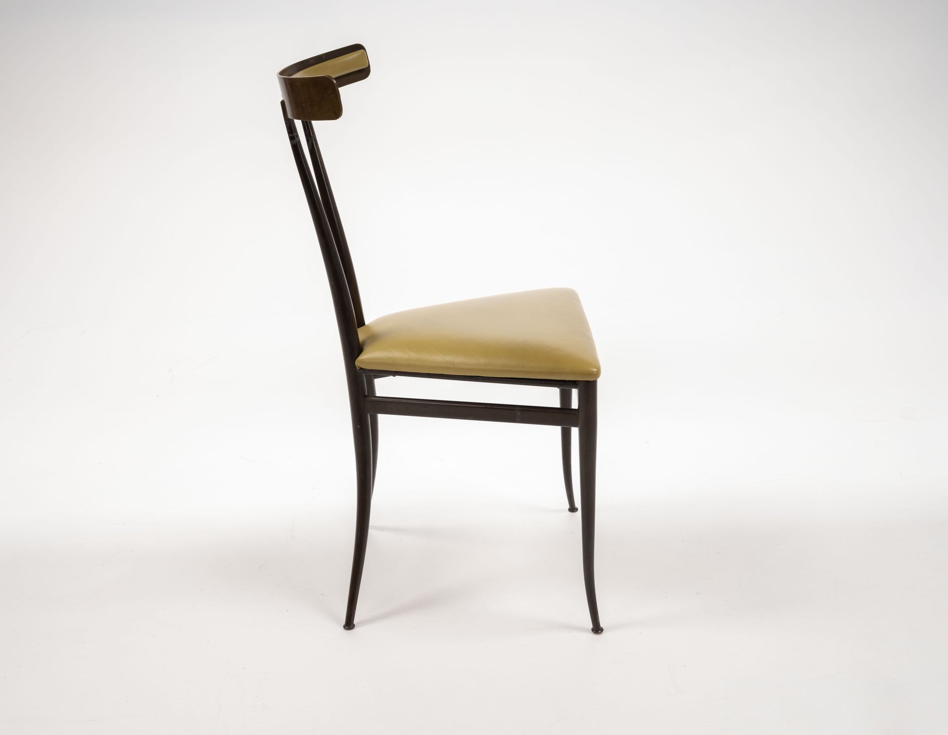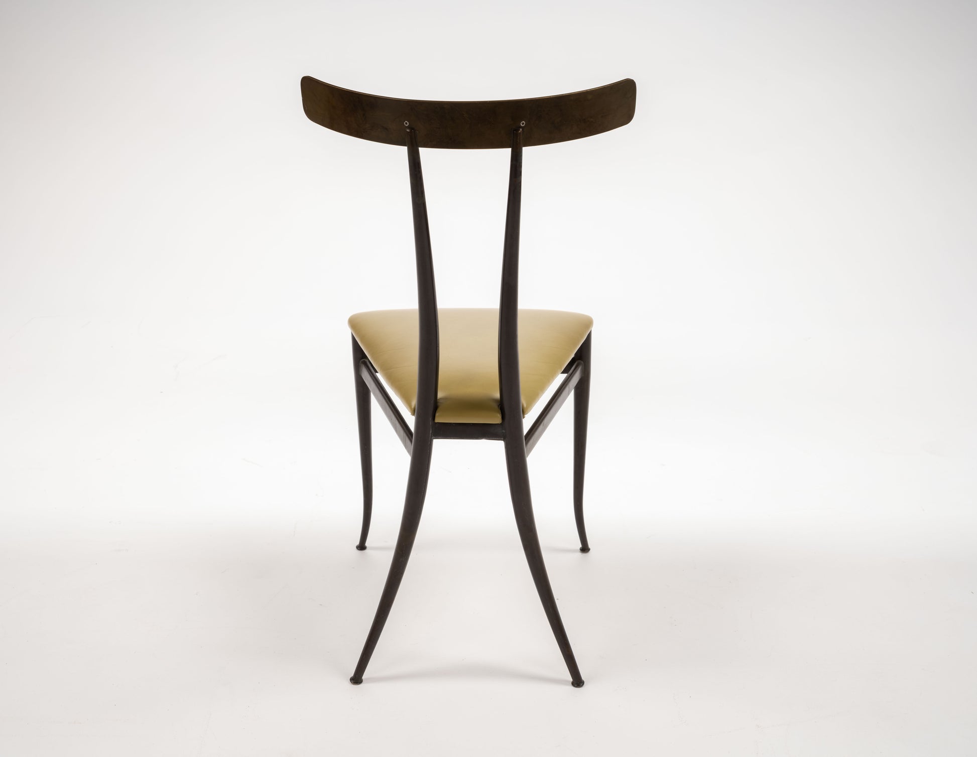 Beautifully patinated brass Klismos chair with original triangular seat, featuring a supple chartreuse leather. This chair, is as much a piece of sculpture as it is seat.The slight sculpted back structure is a calm support. The chair is sexy, and elegant, truly a collectors piece.