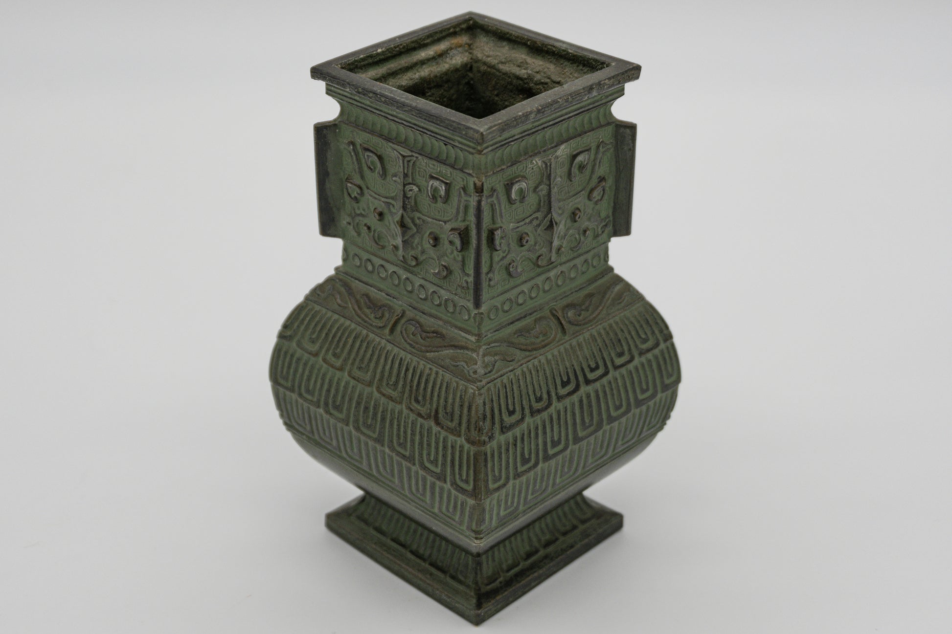 Early 20th century Chinese bronze vessel. All sides feature an identical animal-face motif at the top and stylized shapes that resemble animal feathers towards the base of the vase.