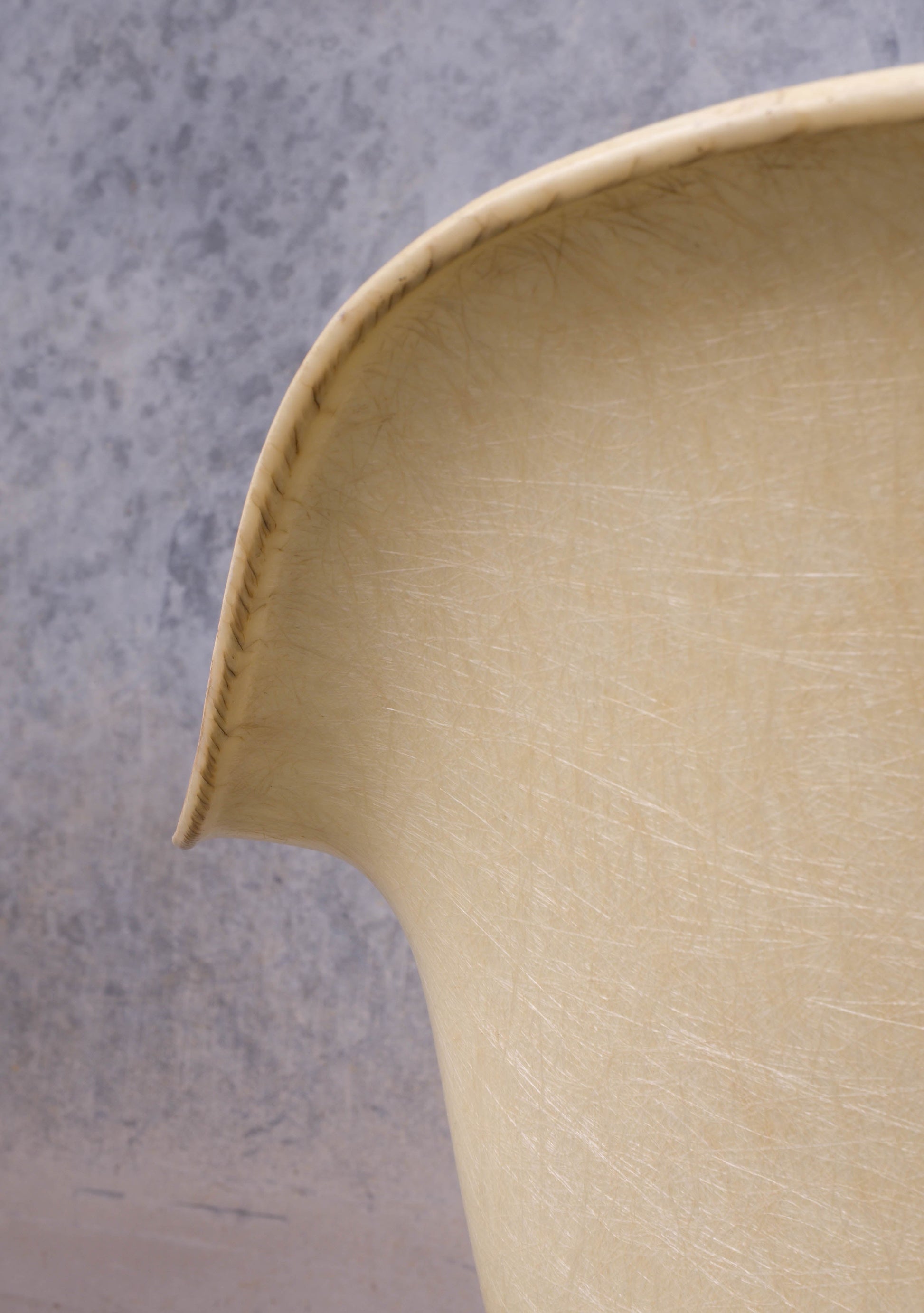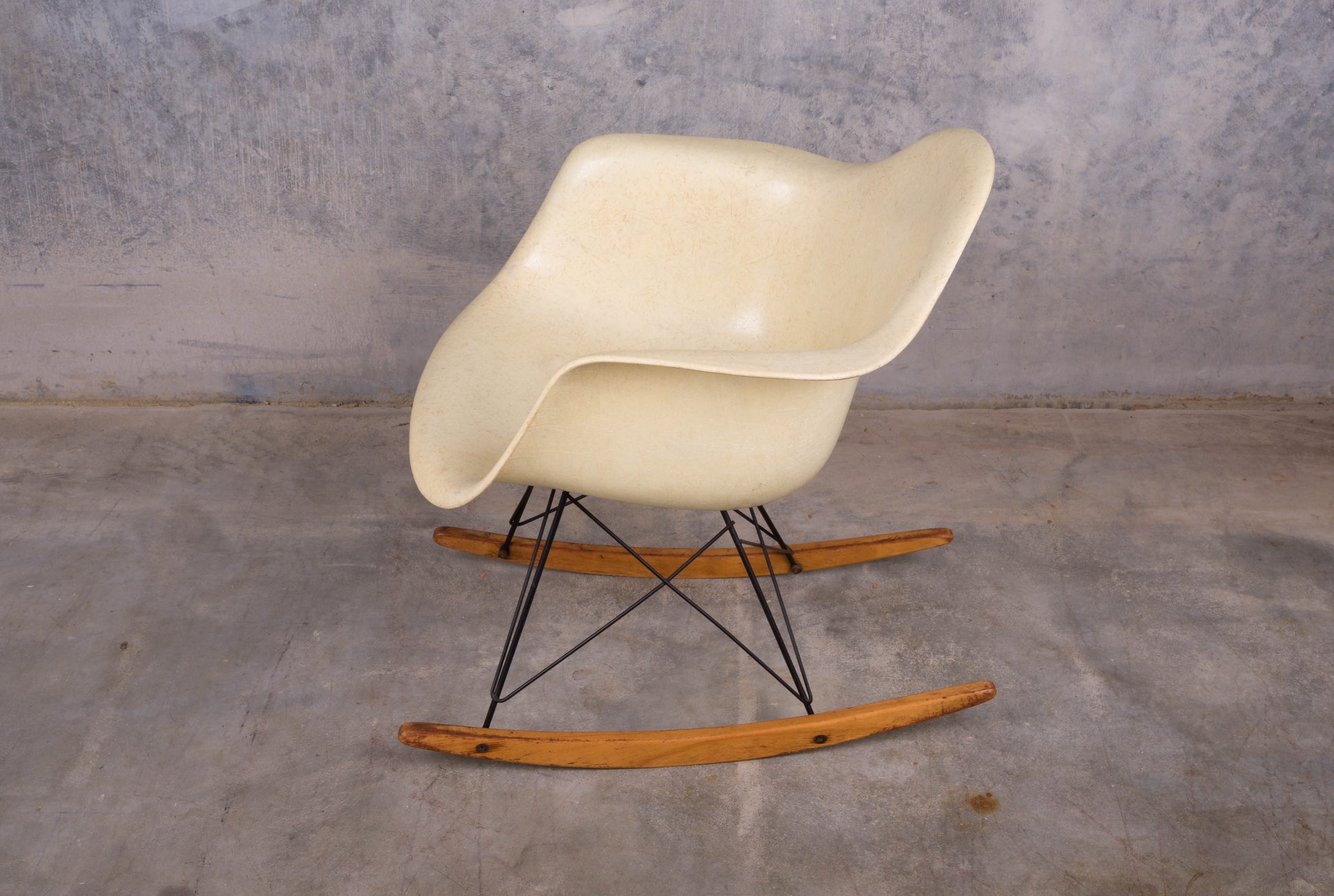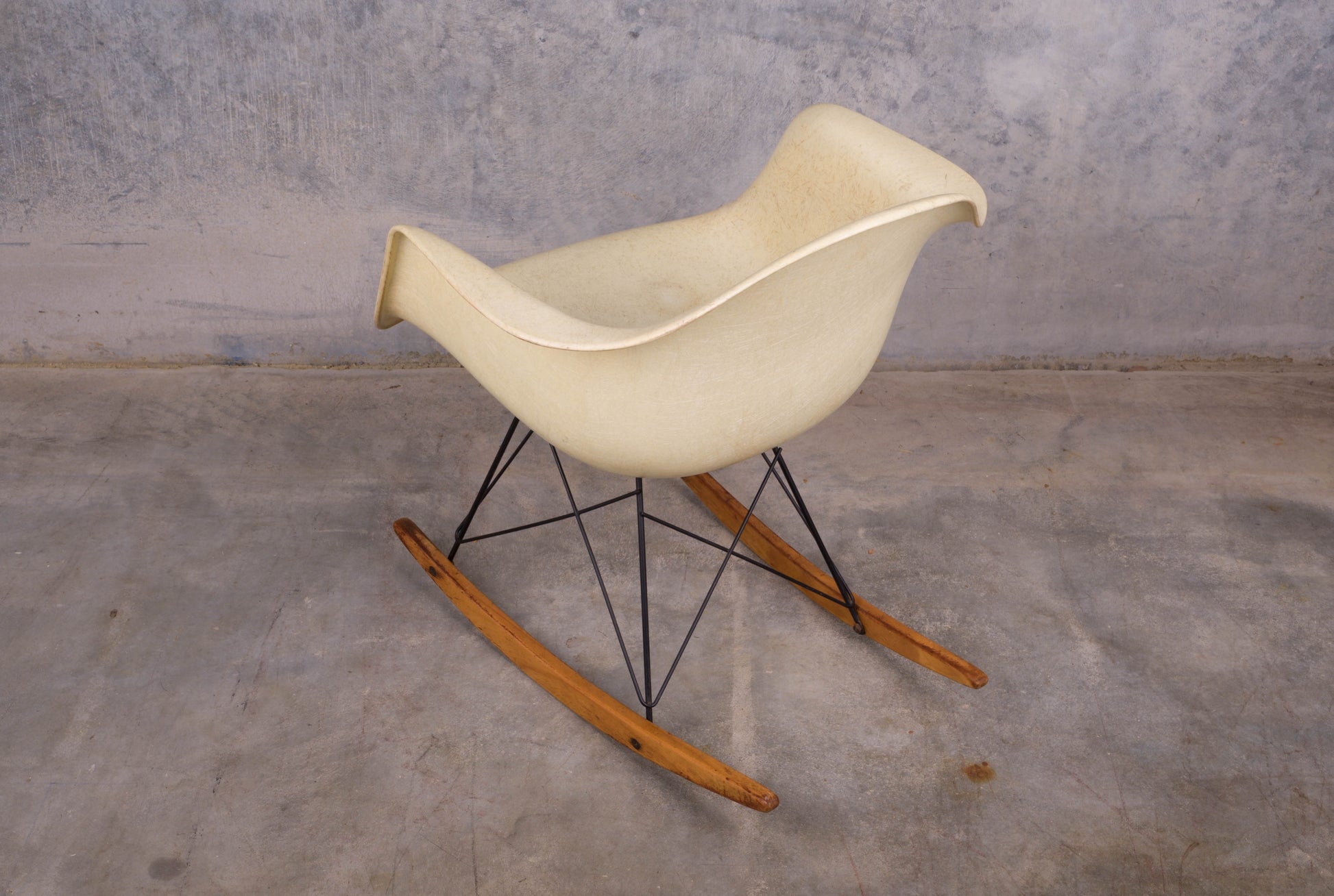 Rocking chair designed by Charles Eames for Herman Miller circa 1950s. This is a rare early production example, as noted by the rope edge and early label. Original rocker base as shown or a Cats Cradle base is available.