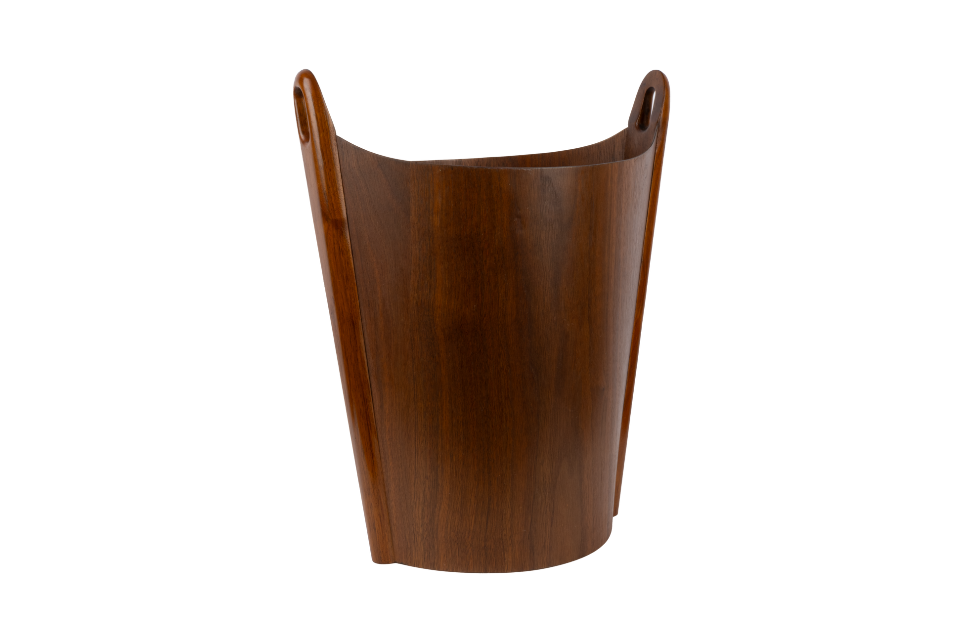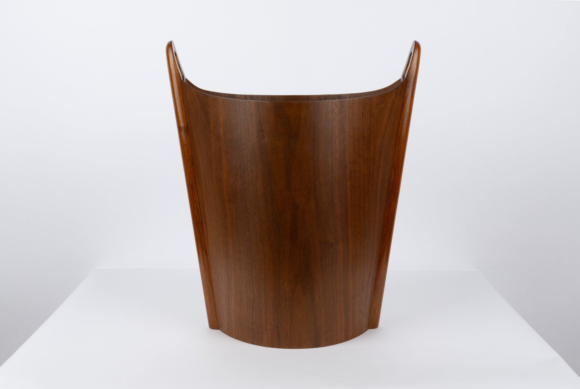 Wastebasket designed by Einar Barnes for P.S. Heggen, circa 1960s. Constructed using thin teak plywood attached with solid teak handles.