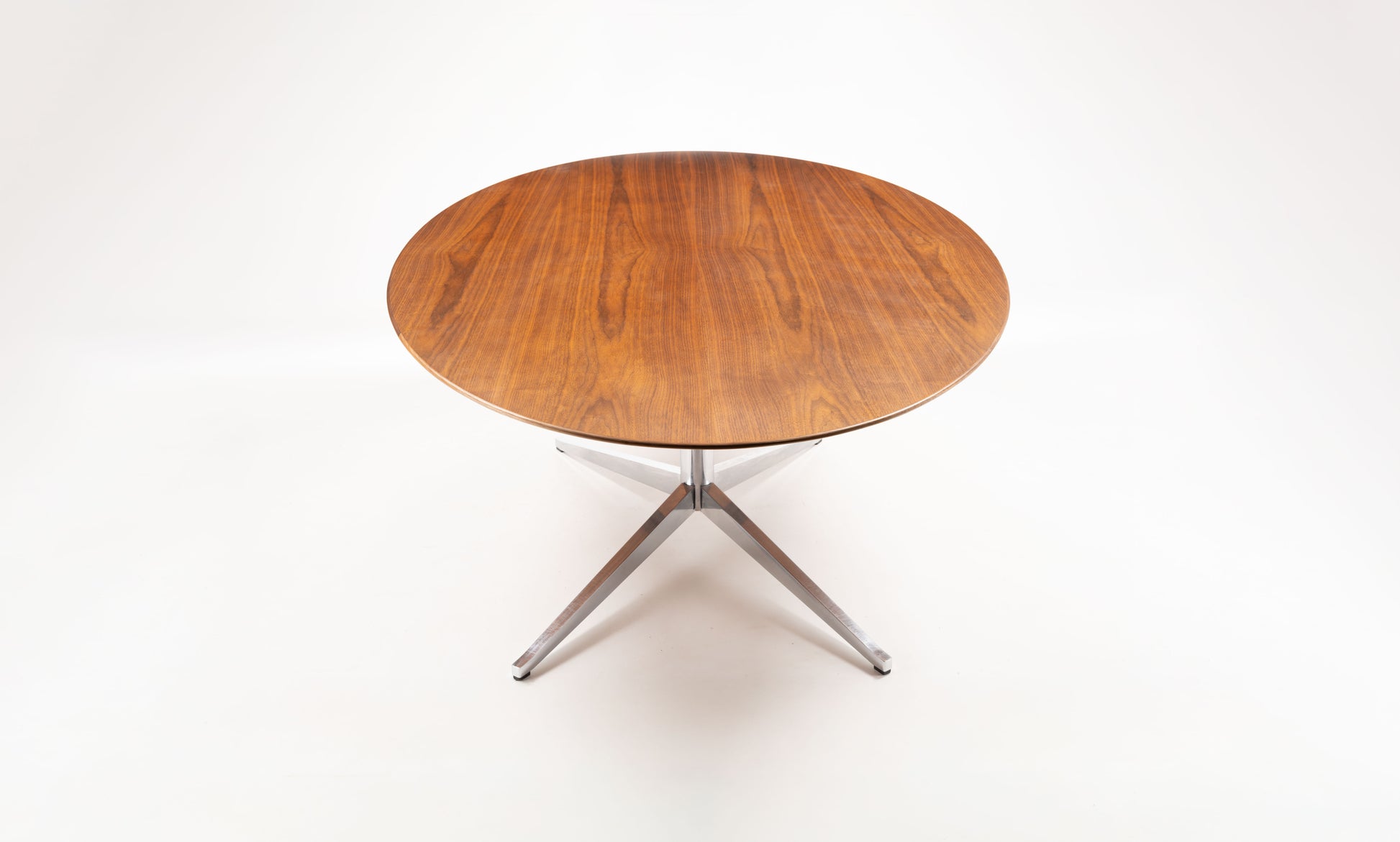 Designed by Florence Knoll in 1961, the Oval Walnut & Chrome Table Desk features a finely grained walnut top and a polished chrome four-star base. Suitable a dining table, executive desk, or conference table. Its clean lines and durable construction make it a timeless addition to any space.