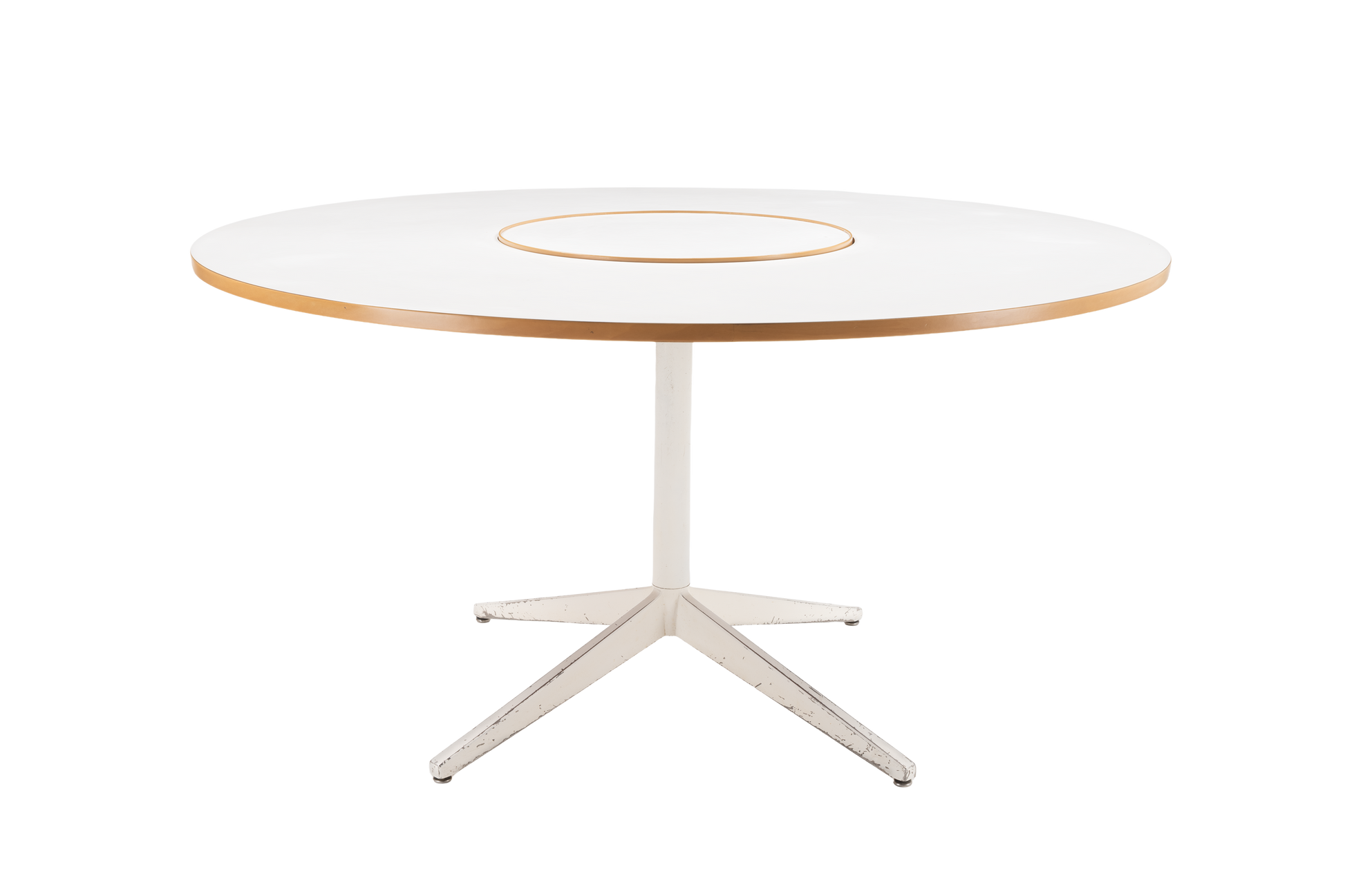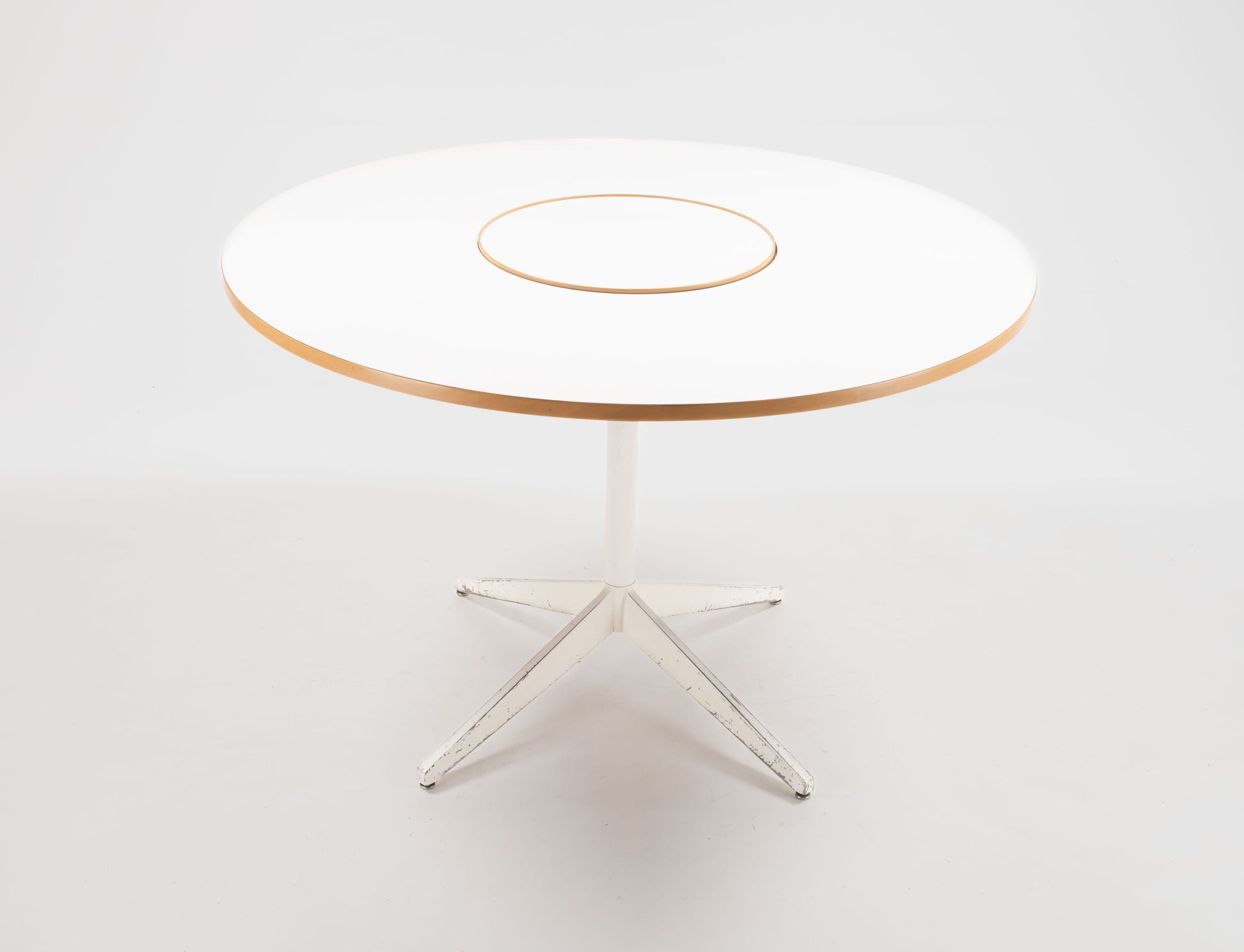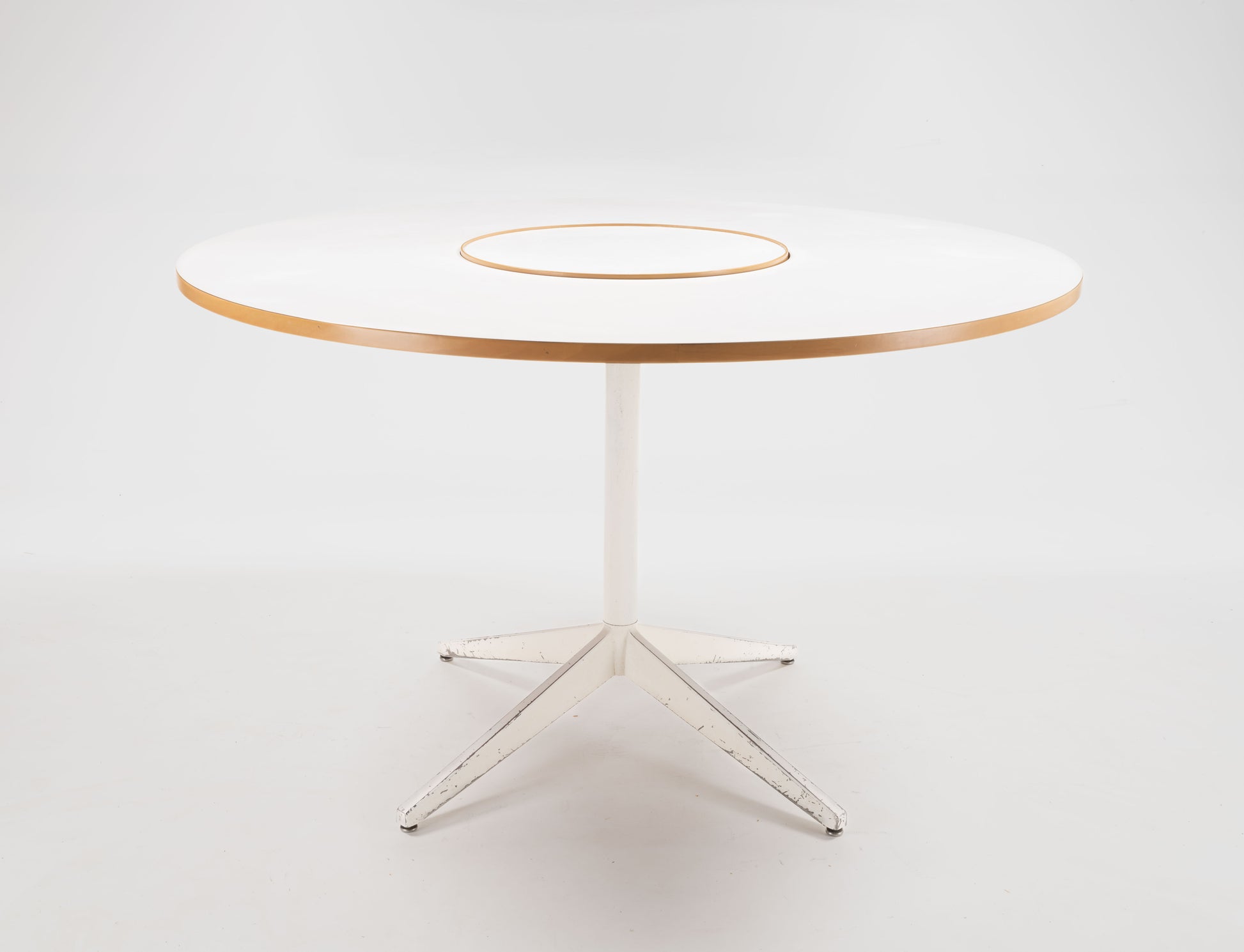 Designed by George Nelson for Herman Miller in the 1950s, this circular dining table features a white laminate top with a central rotating Lazy Susan, which rests on a sleek white powder-coated metal pedestal base with four angled legs.