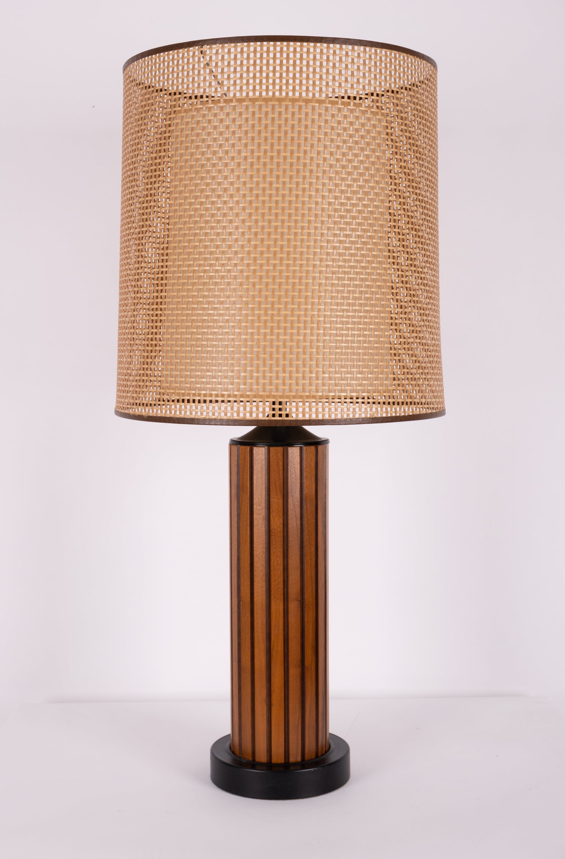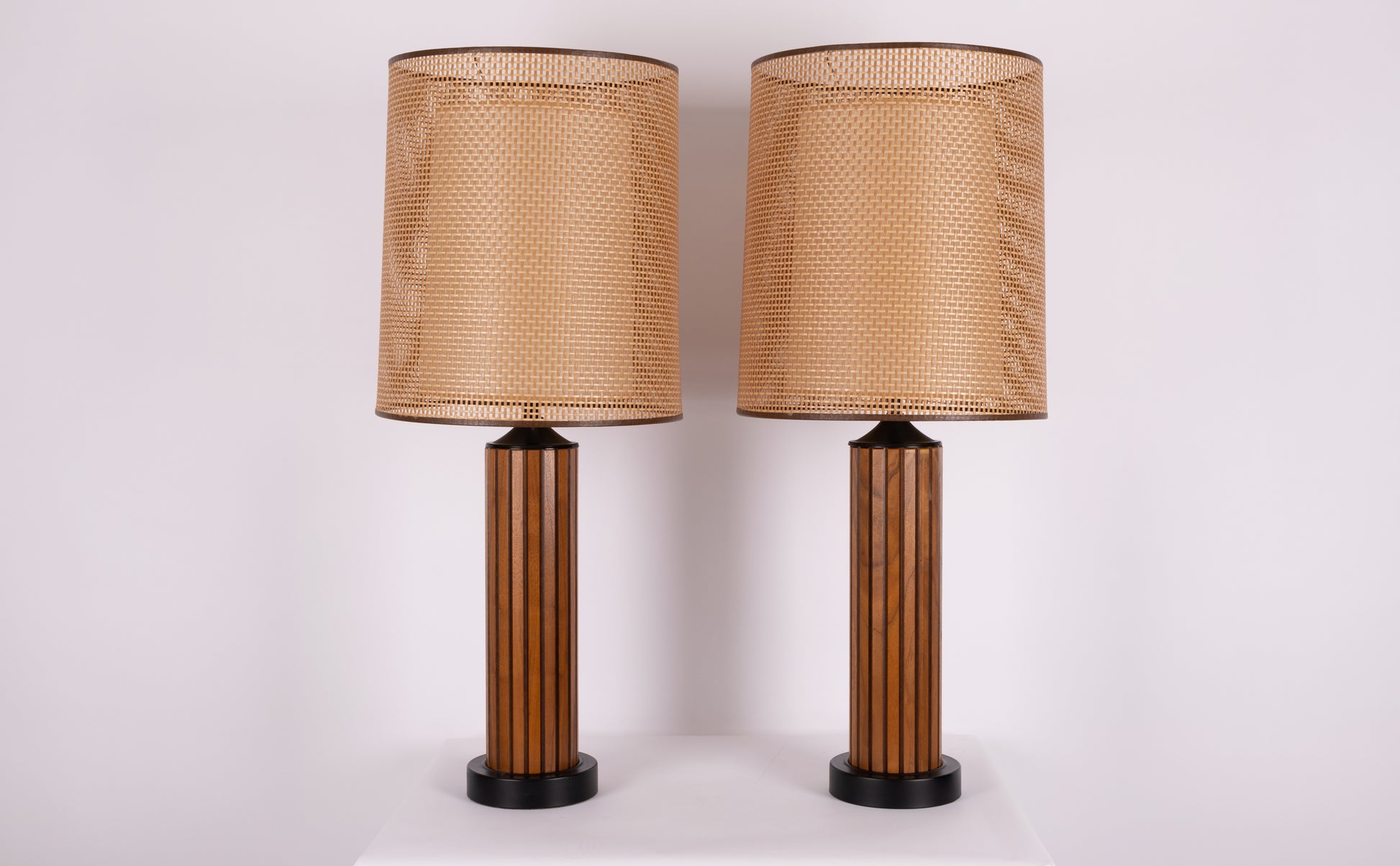 Pair of vintage 1960s walnut table lamps, complete with center diffusers and exterior cane shades. Body features walnut and black accents on the base and neck. Original shades absolutely pristine.
