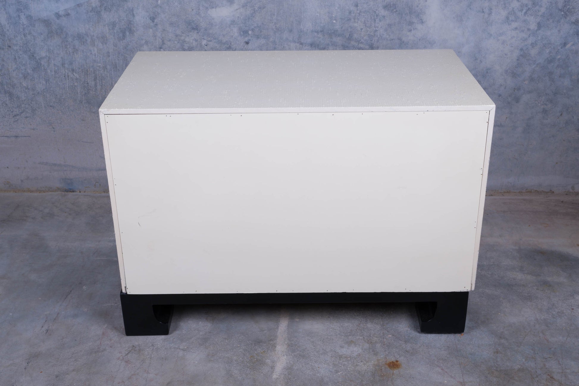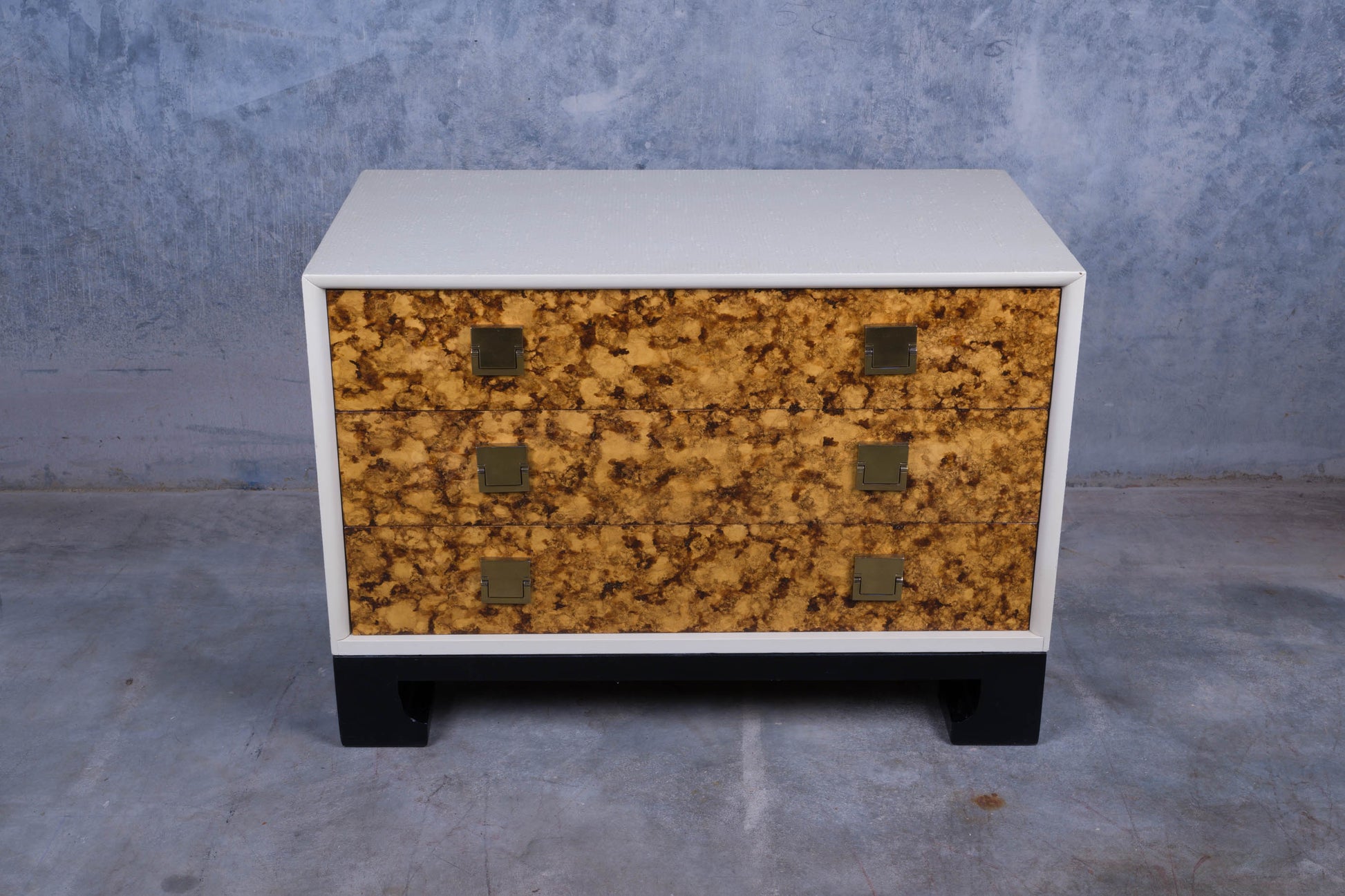 Three drawer faux tortoiseshell cabinet. Surface of the exterior of the body features a white riveting and sits on top a solid black lacquered base with carved feet on the front. Hardware is comprised of period solid brass.