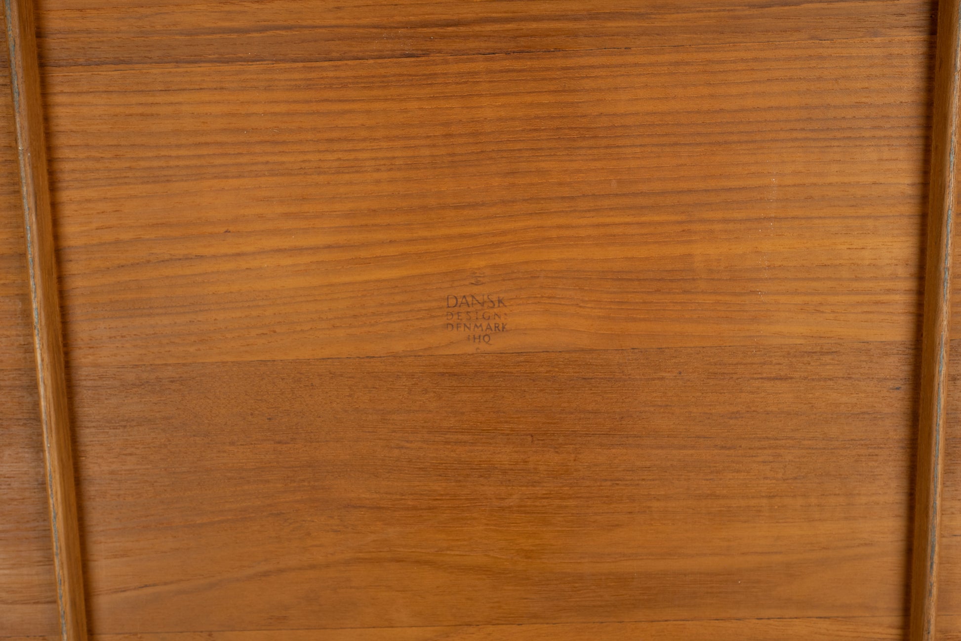 Large teak tray designed by Jens Quistgaard for Dansk in the 1950s. Includes a raised, sculpted perimeter and handles. Branding visible on the underside featuring the four ducks logo.