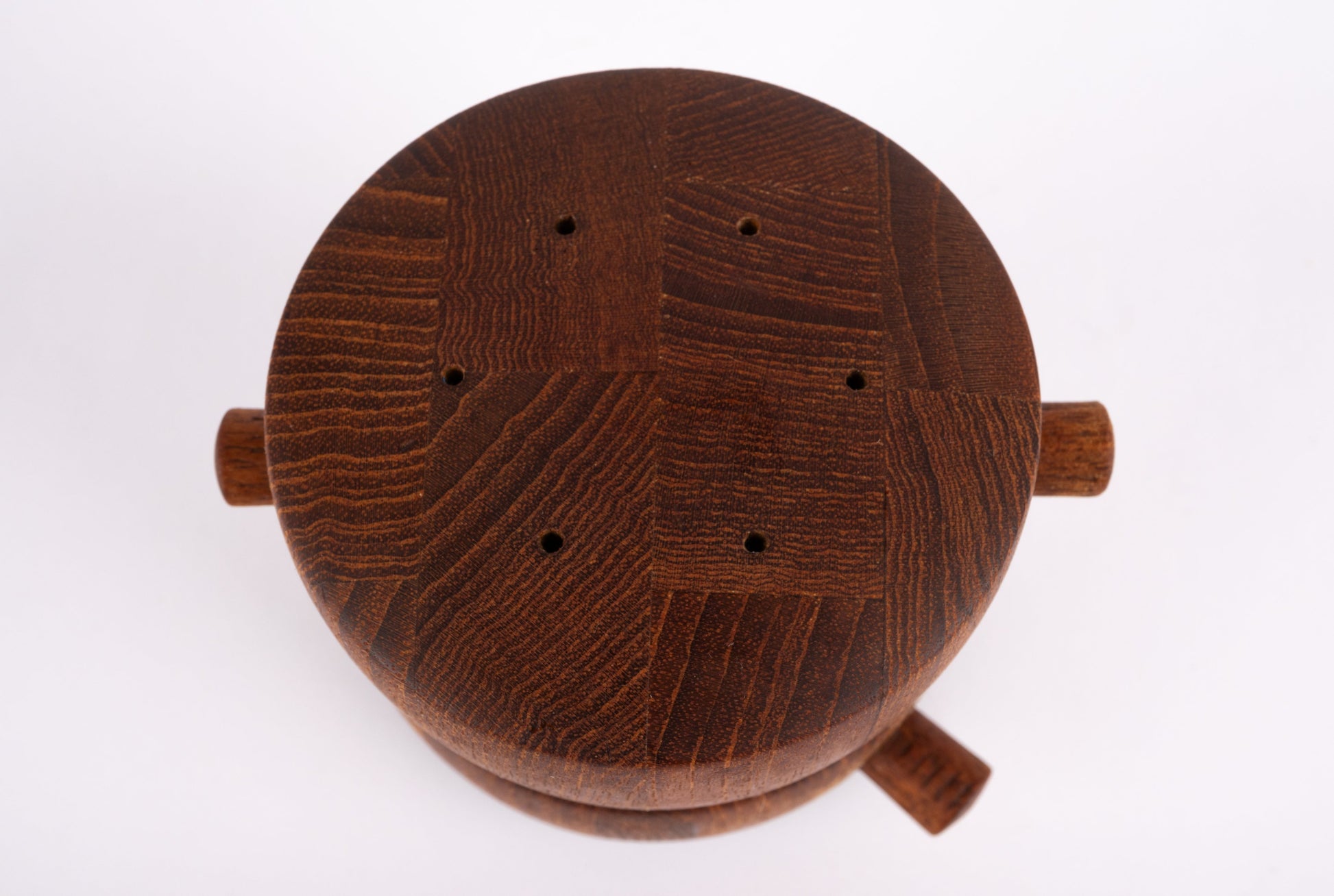 Rare 1964 salt shaker and pepper mill by Jens Quistgaard. Each component features the use of end grain teak. Mechanism is all metal Peugeot, made in France.