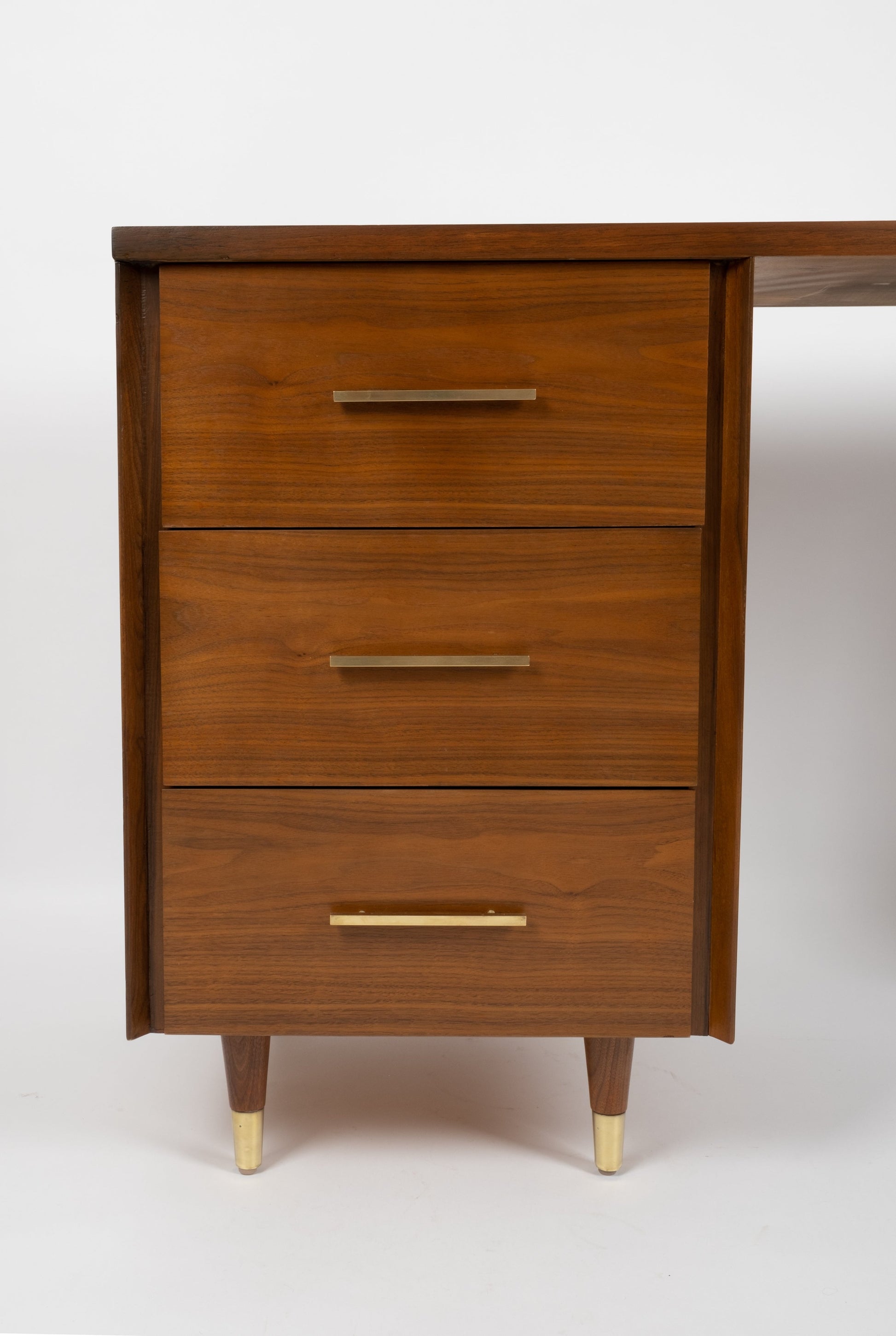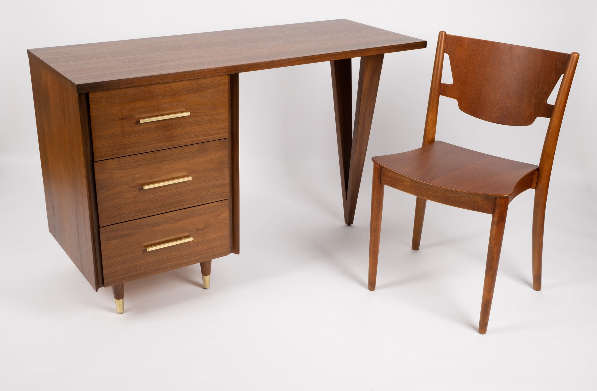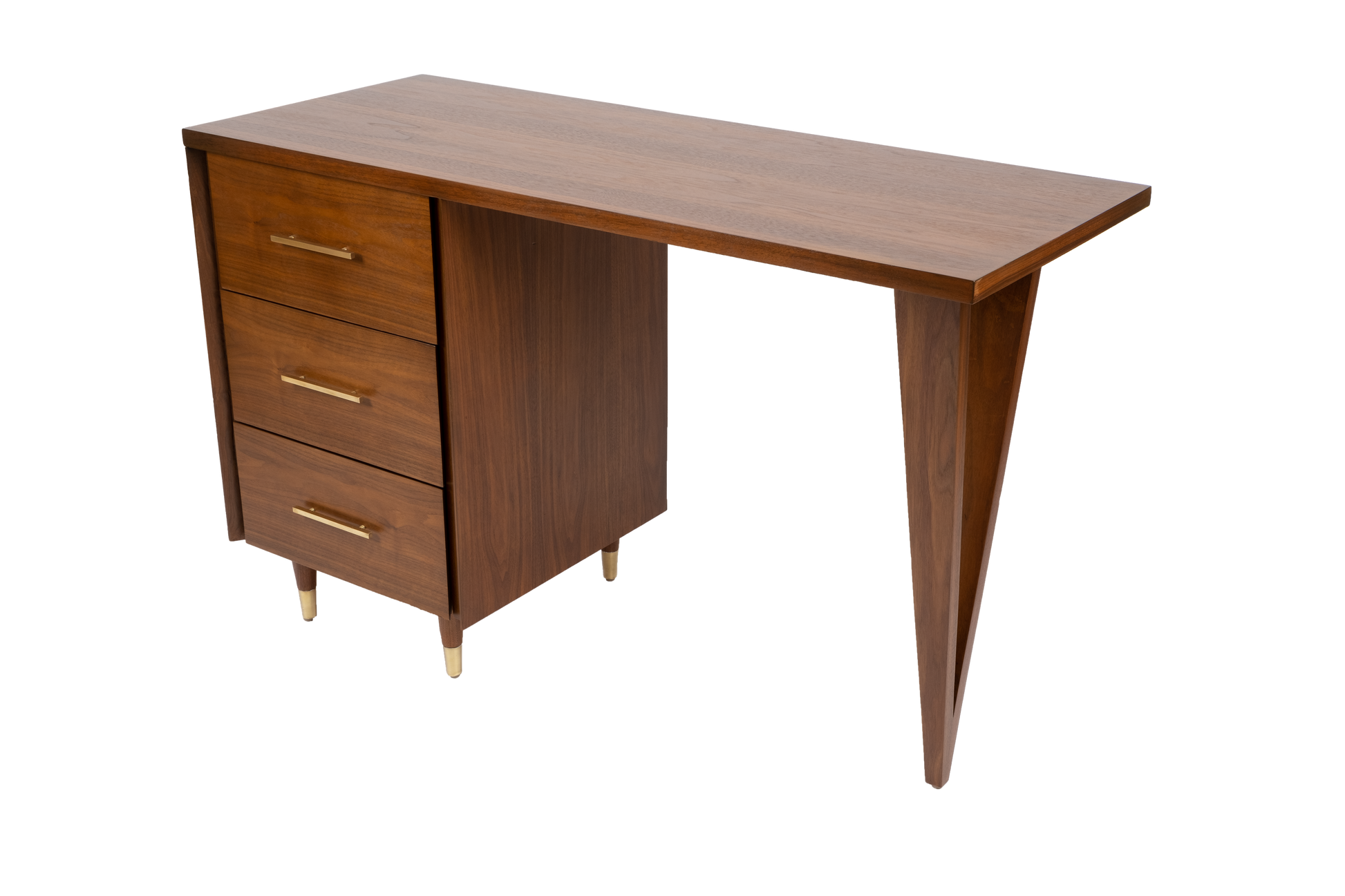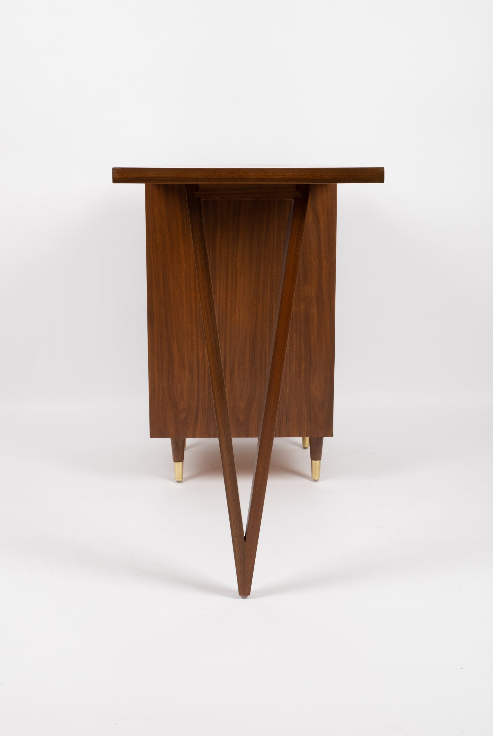 Desk designed by John Stuart with unique triangular leg design. Features three drawer cabinet with brass handles, connected to four tapered legs which include matching brass feet.