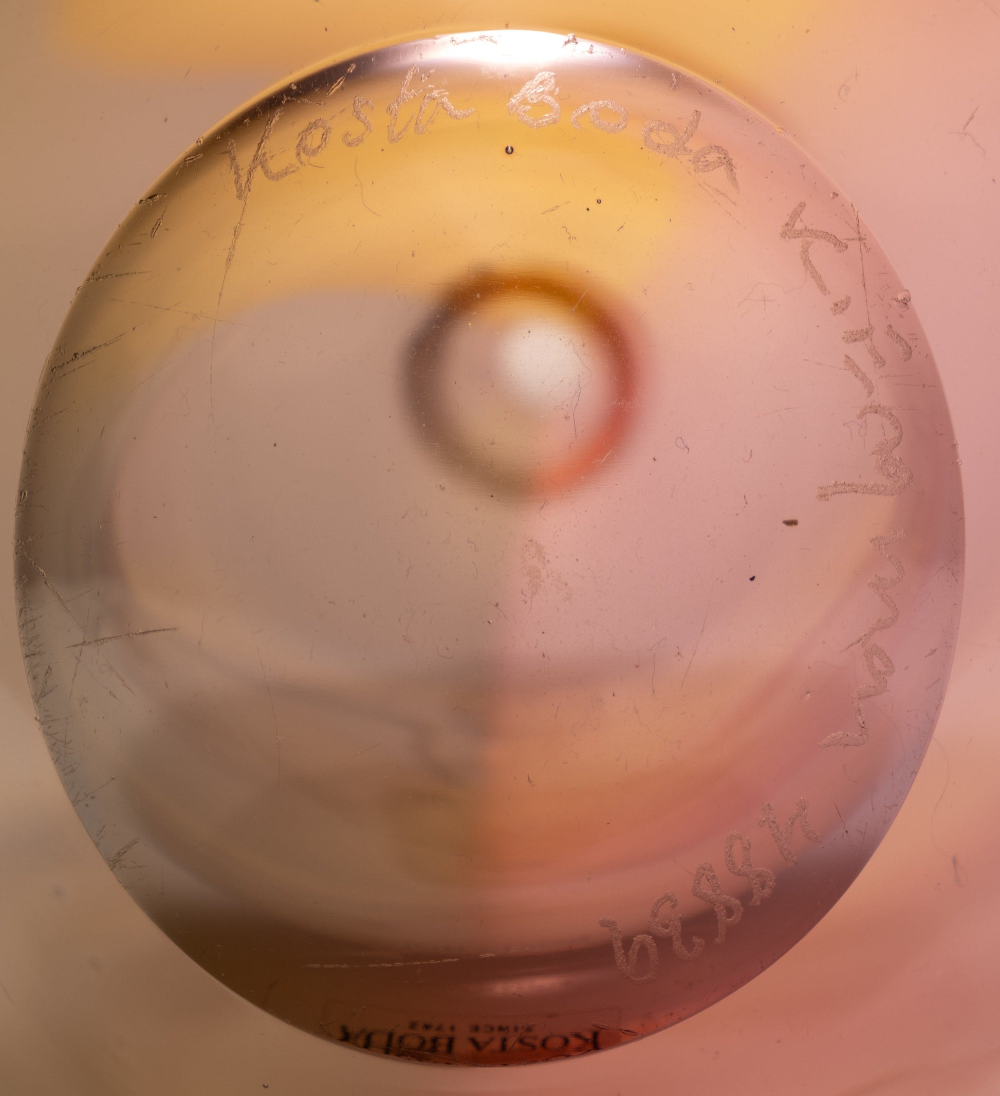 Glass vase/bottle made by Kjell Engman for Kosta Glassworks in Sweden as part of the Kosta Boda Artist Collection. Engman, a Swedish glass artist created Fidji, which means an object of multiple colors merged into one whose shape bears a resemblance to the musical instrument organ pipe. His work can be found at the Swedish National Museum of Art and Design.