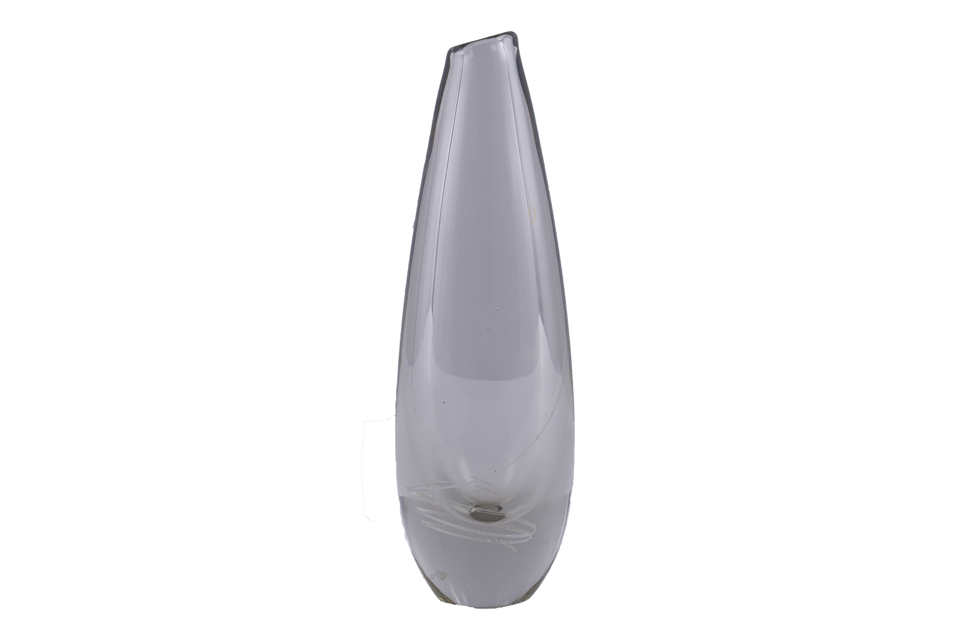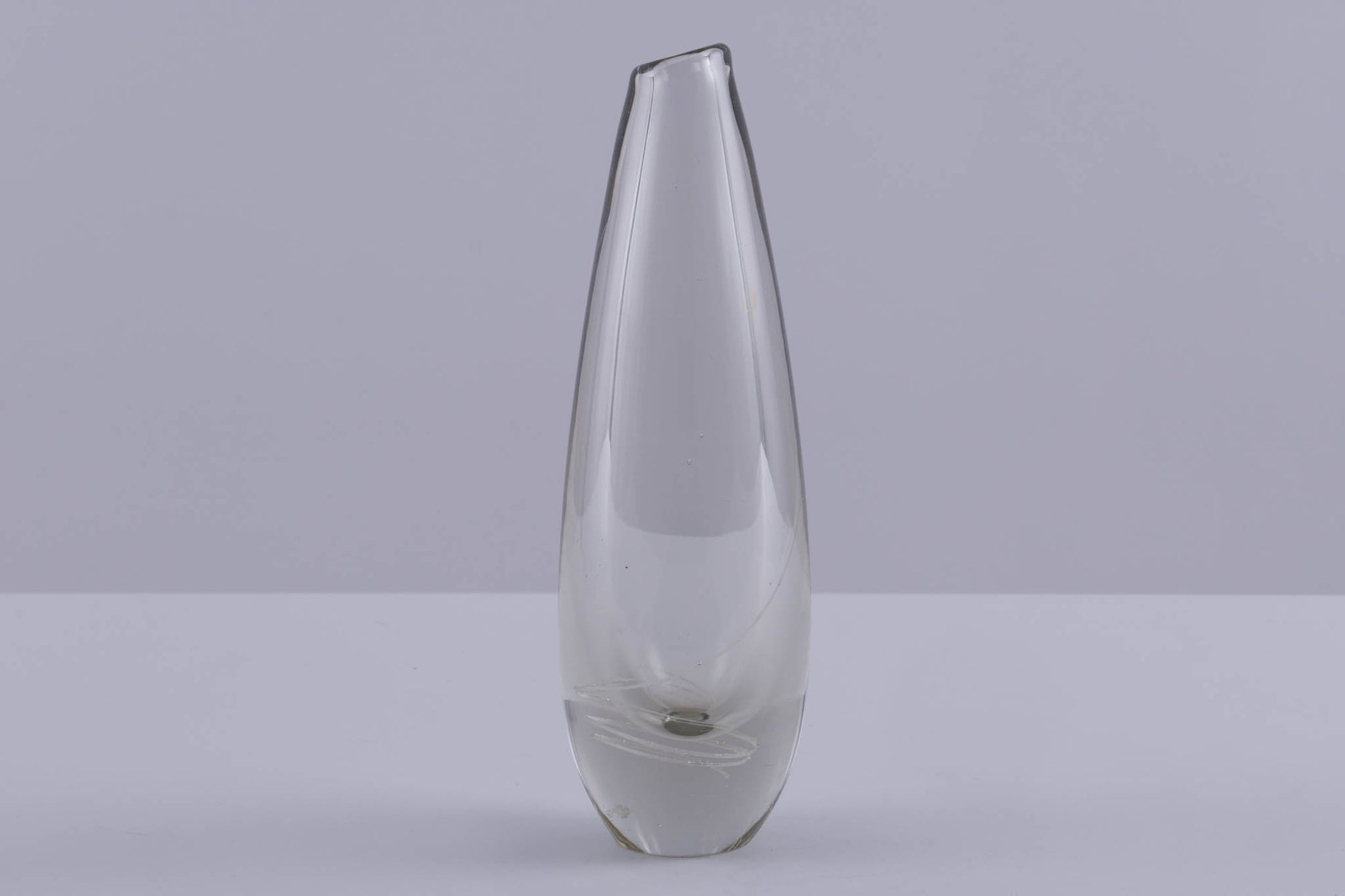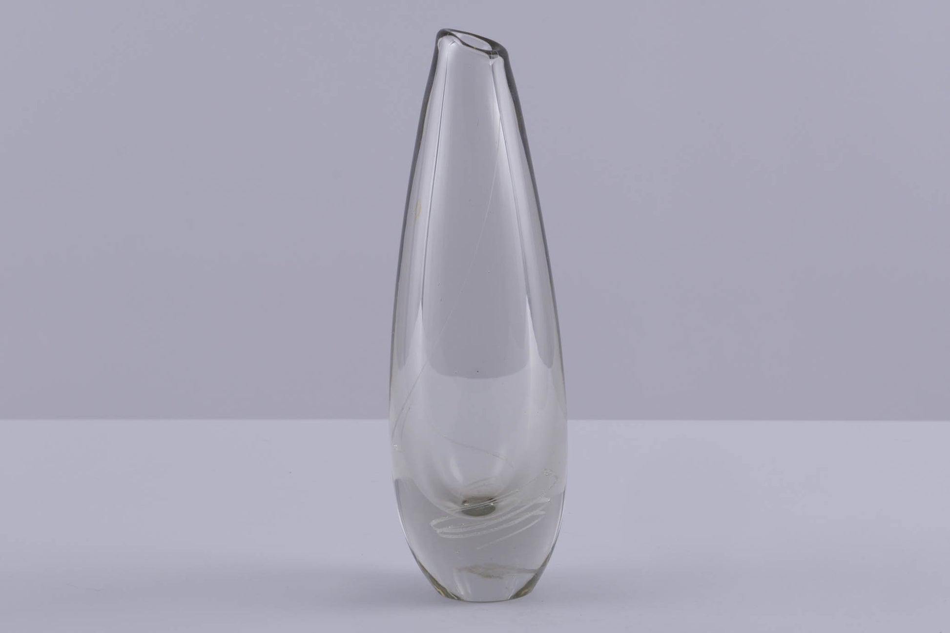Glass vase designed by Mikko Helander. Features an inlaid spiral pattern within the glass.
