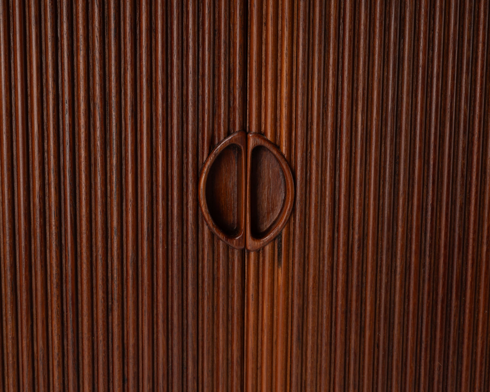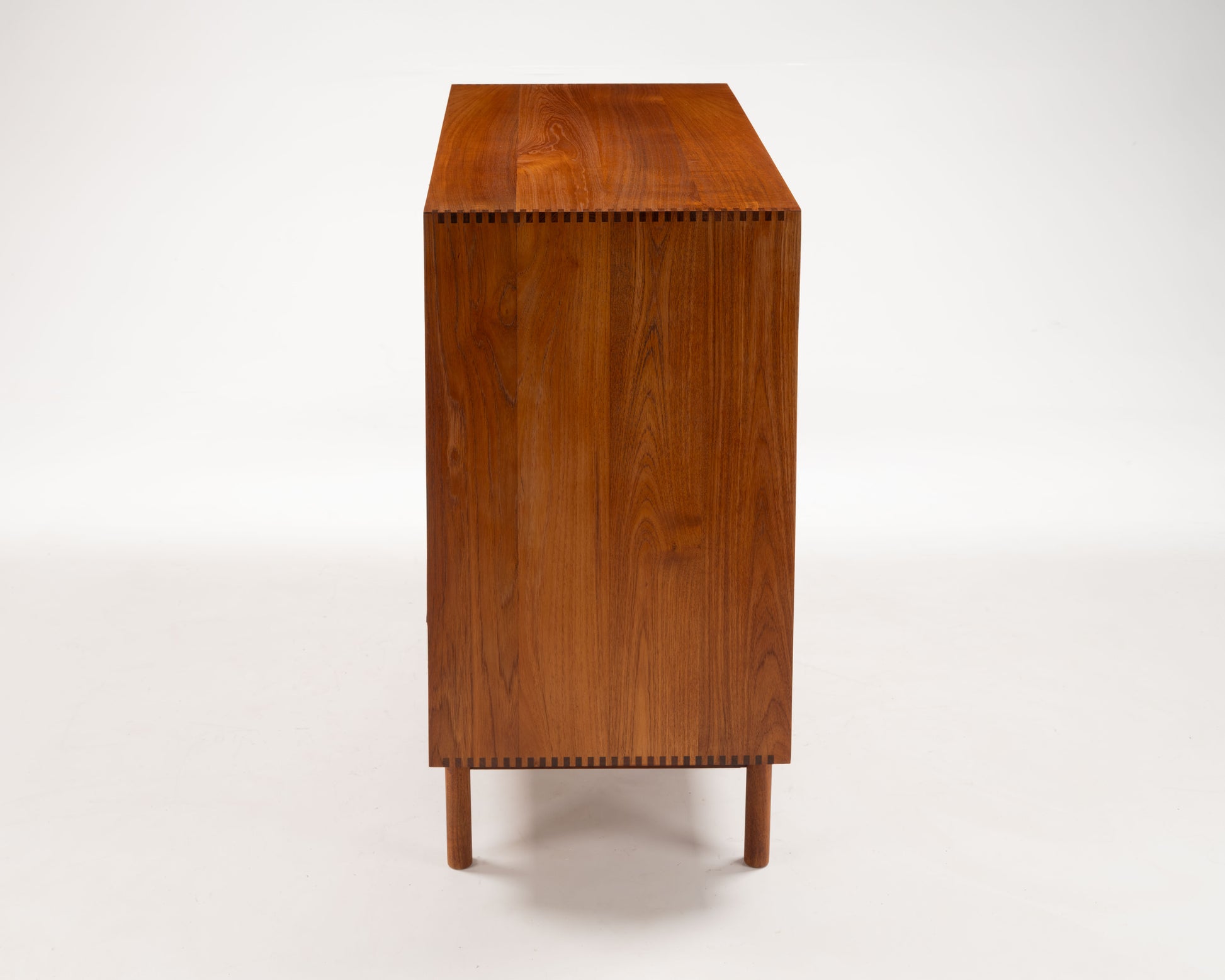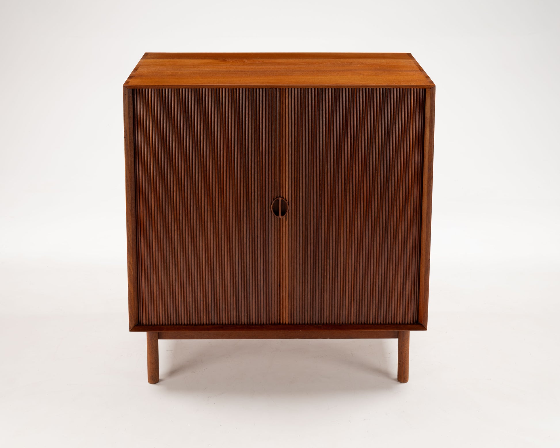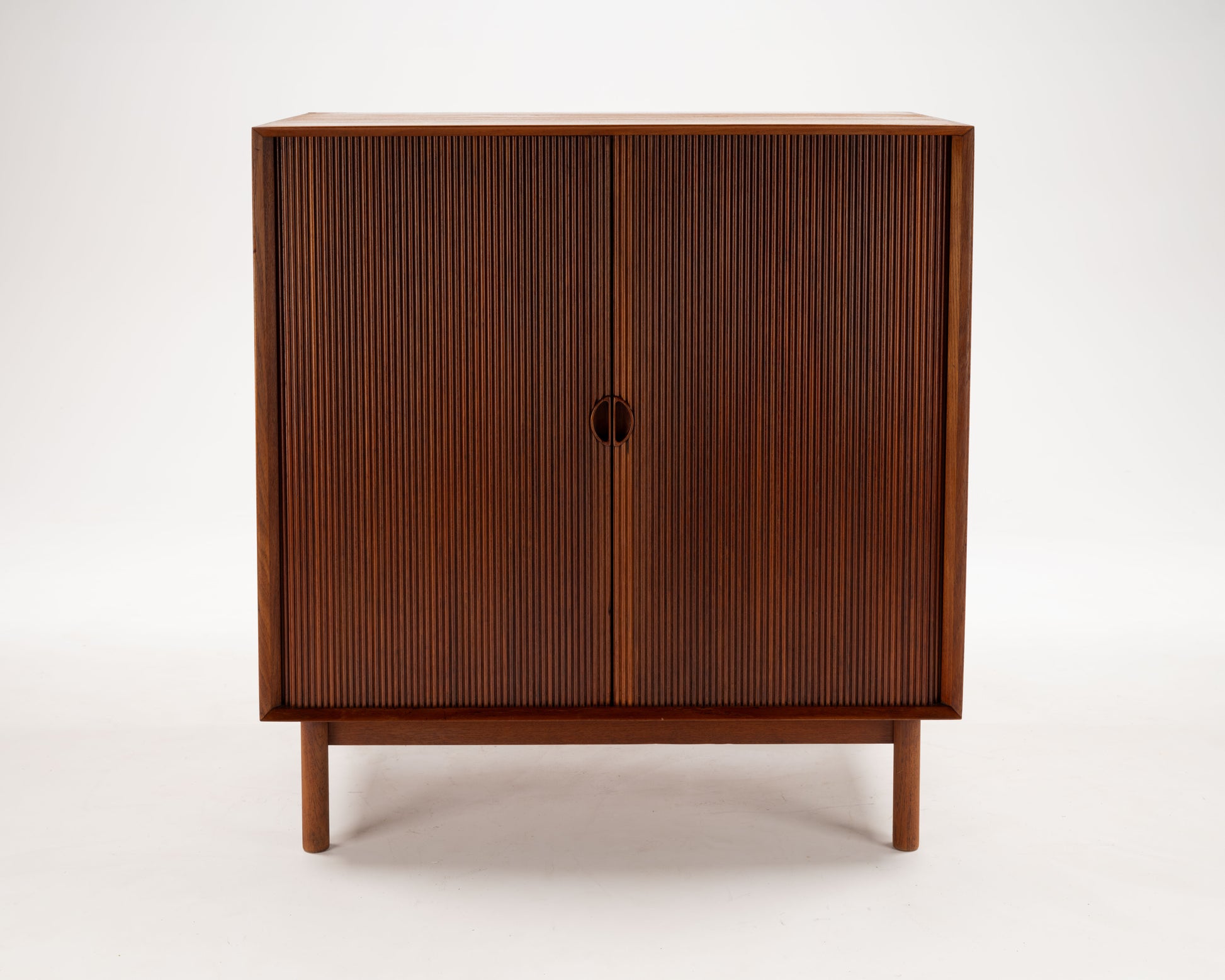 Designed in the late 1950s by Danish Modern masters Peter Hvidt & Orla Mølgaard-Nielsen for Søborg Møbler, this vintage tambour cabinet is crafted of solid Burmese teak. Its clean-lined form features sliding tambour doors, beveled edges, finger-jointed detailing and an adjustable internal shelf for versatile storage.