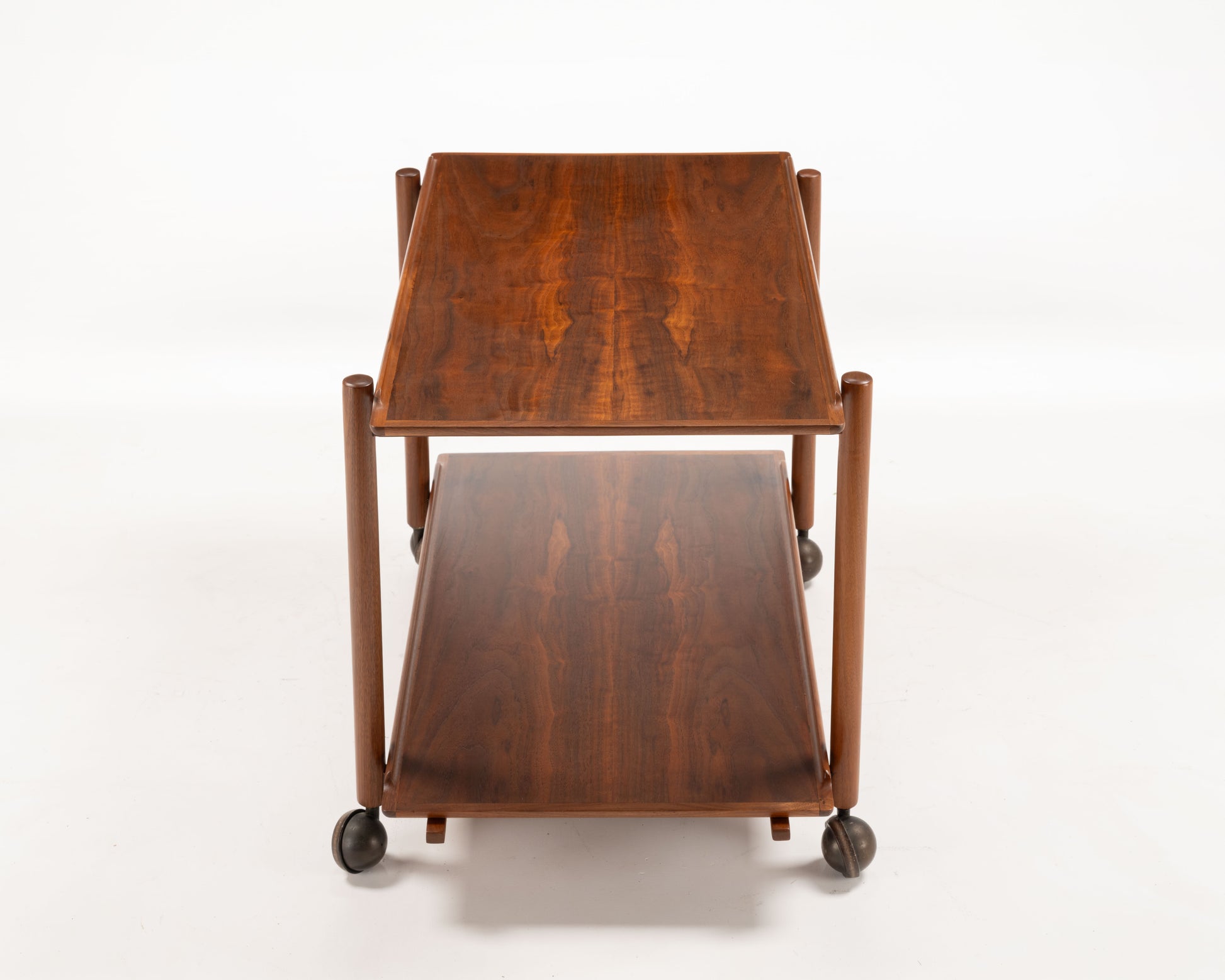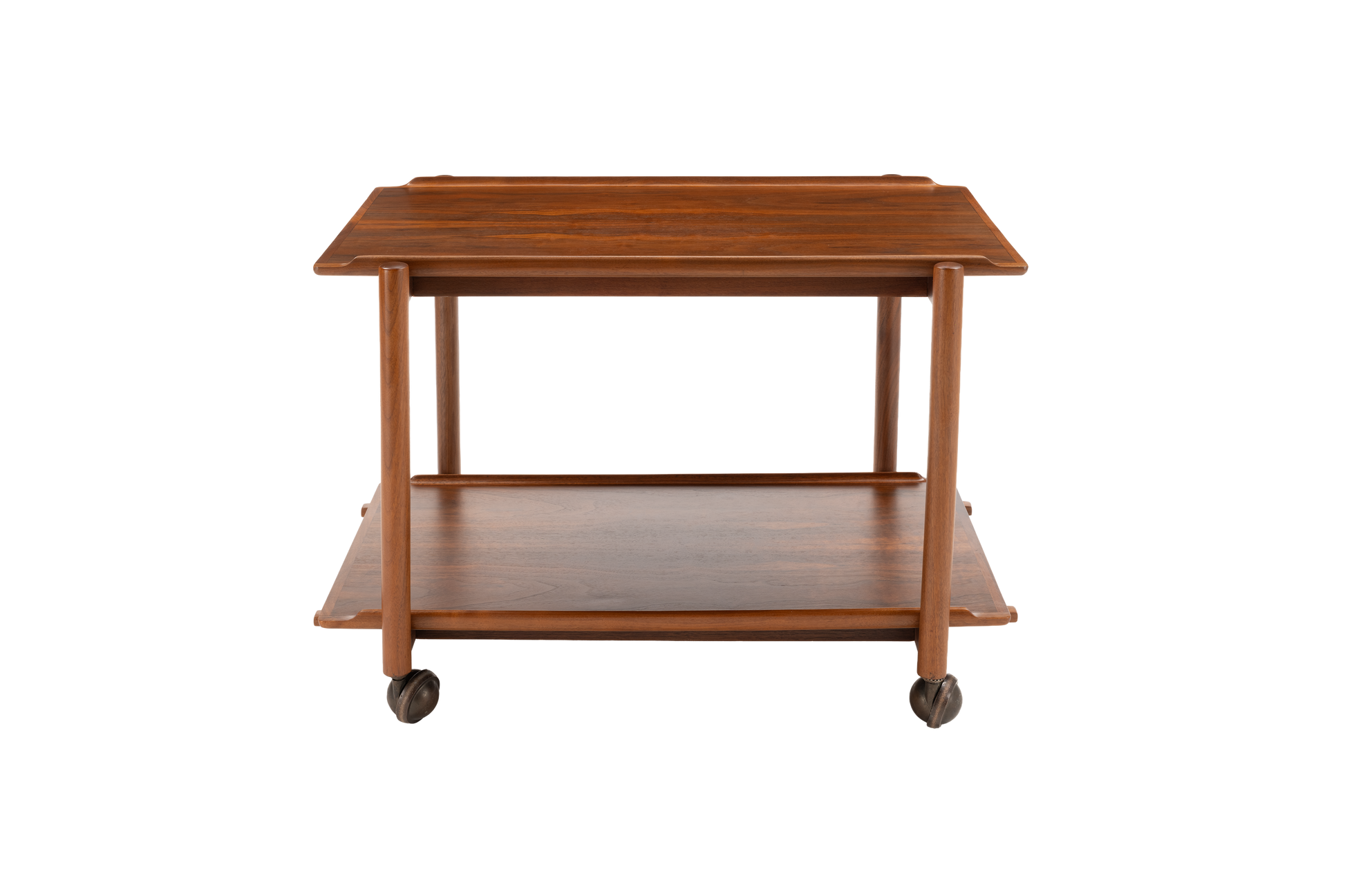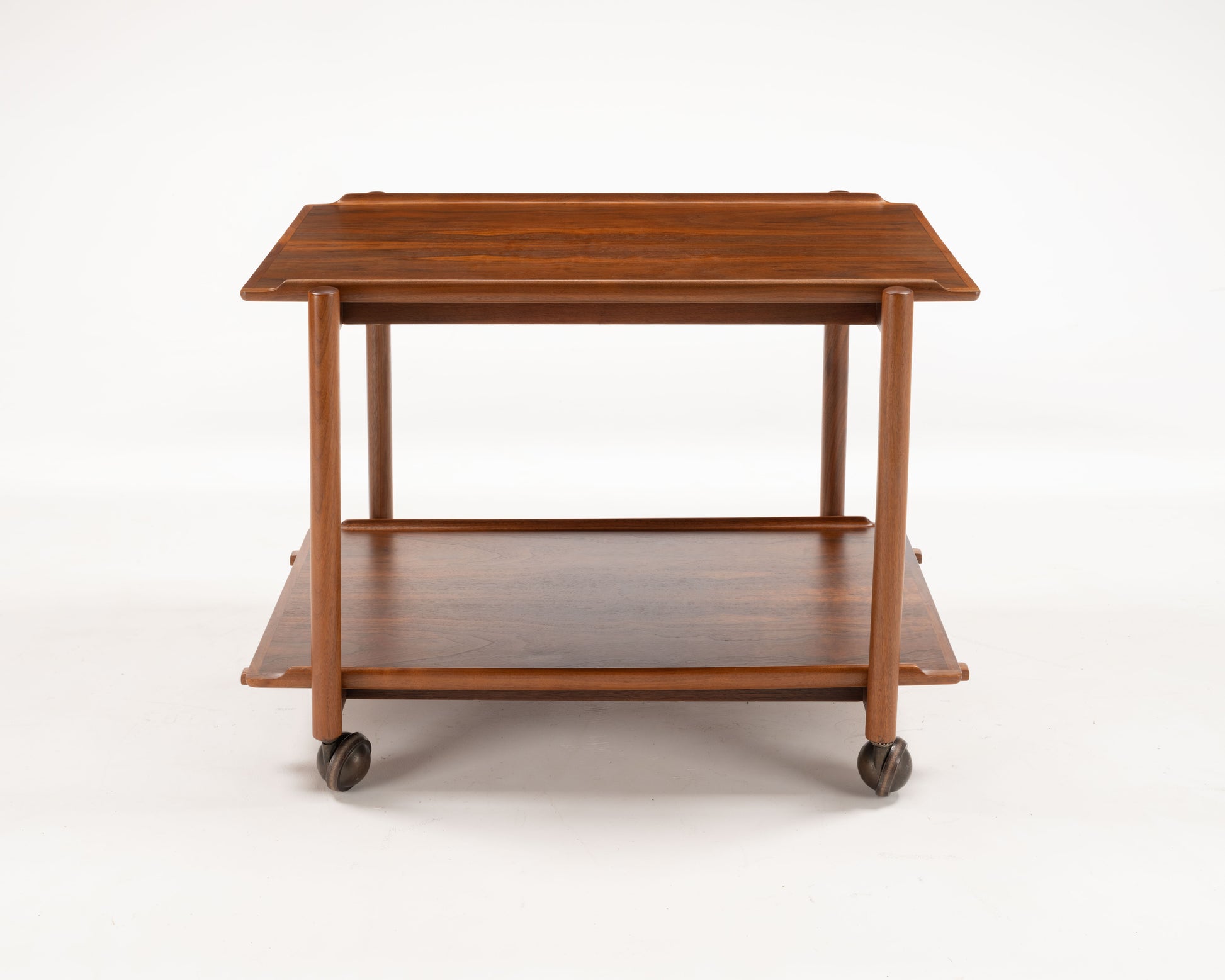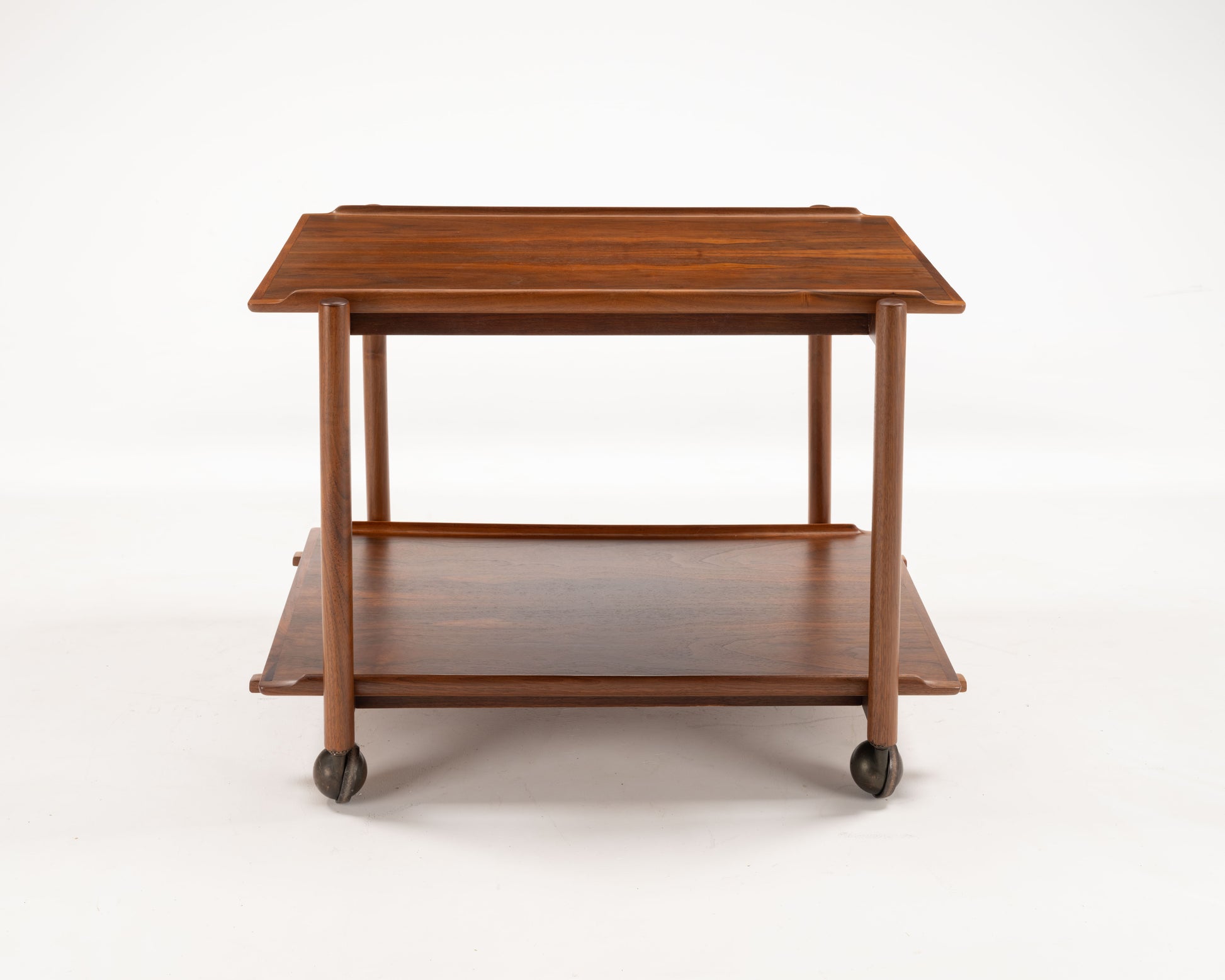 Crafted in the 1950s by Danish designer Poul Hundevad, this teak bar cart features a clever expandable top—where the upper tray slides aside to accommodate the lower tray, doubling the serving surface—it seamlessly combines style and versatility, making it ideal for entertaining in compact spaces. The cart's refined details—such as finger-jointed corners, and turned legs,—highlight the superior craftsmanship characteristic of Danish modern design