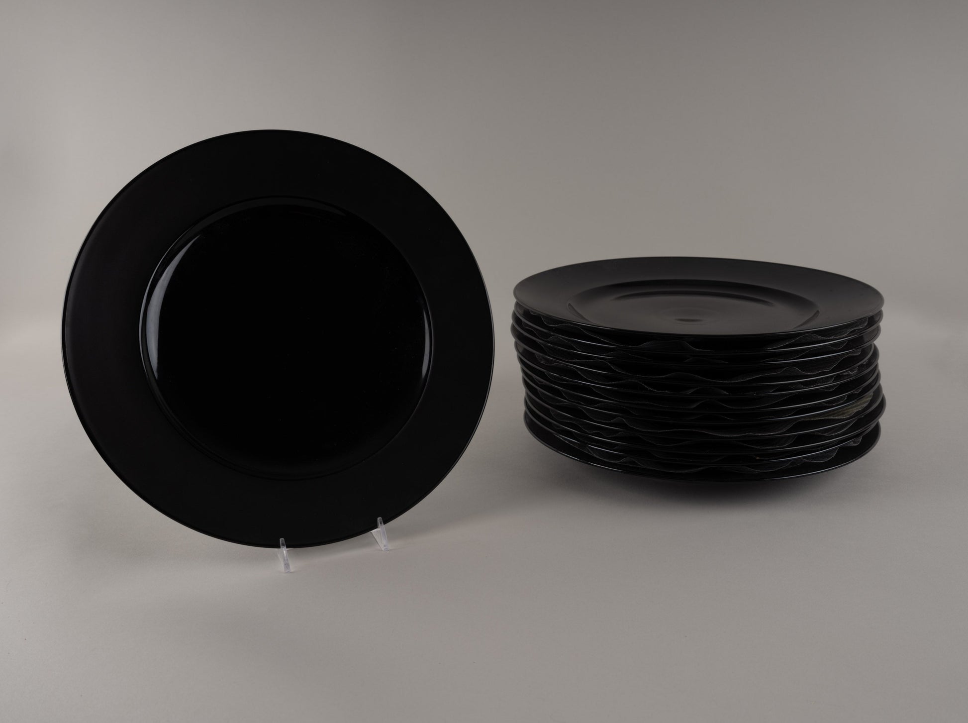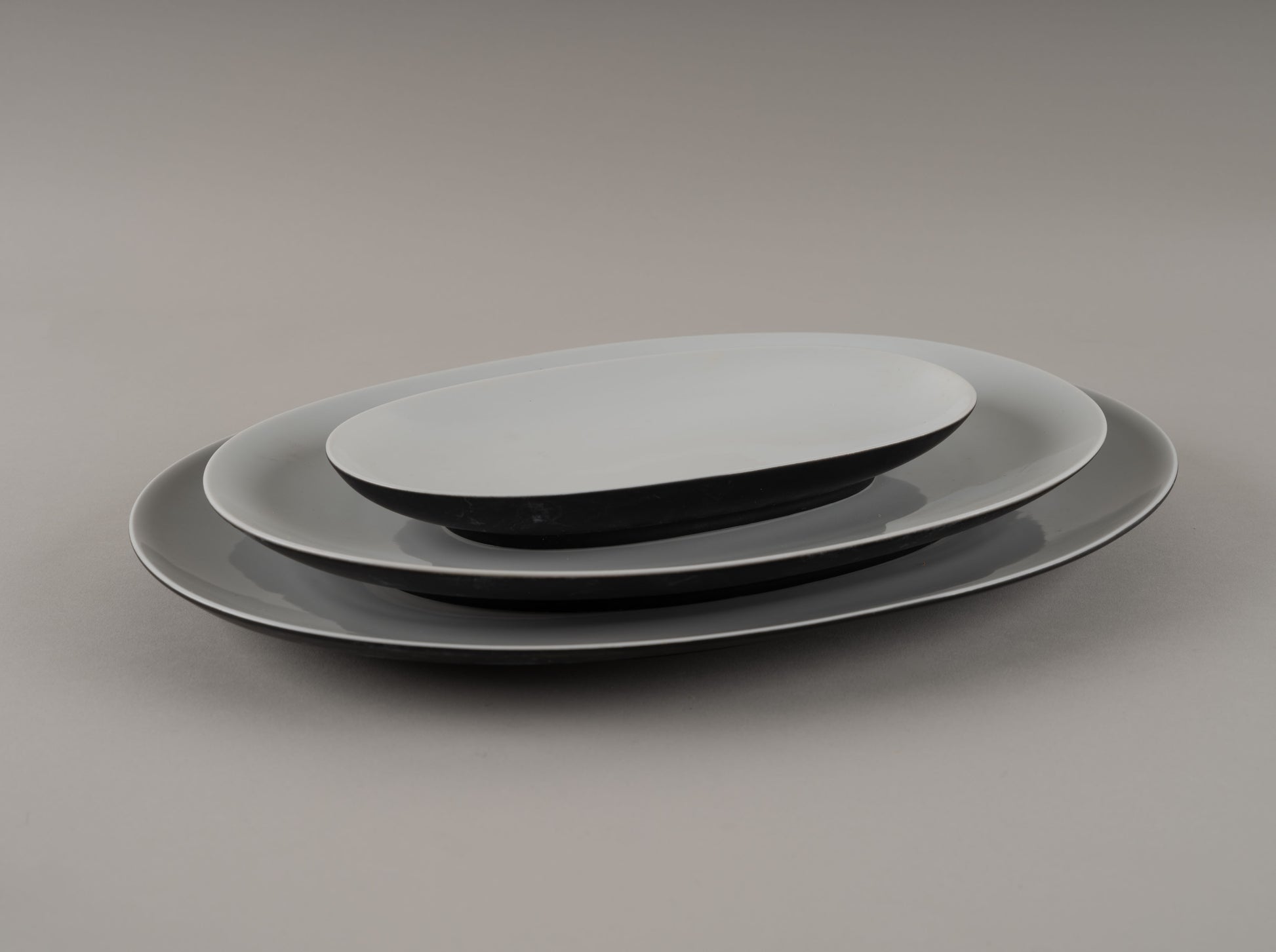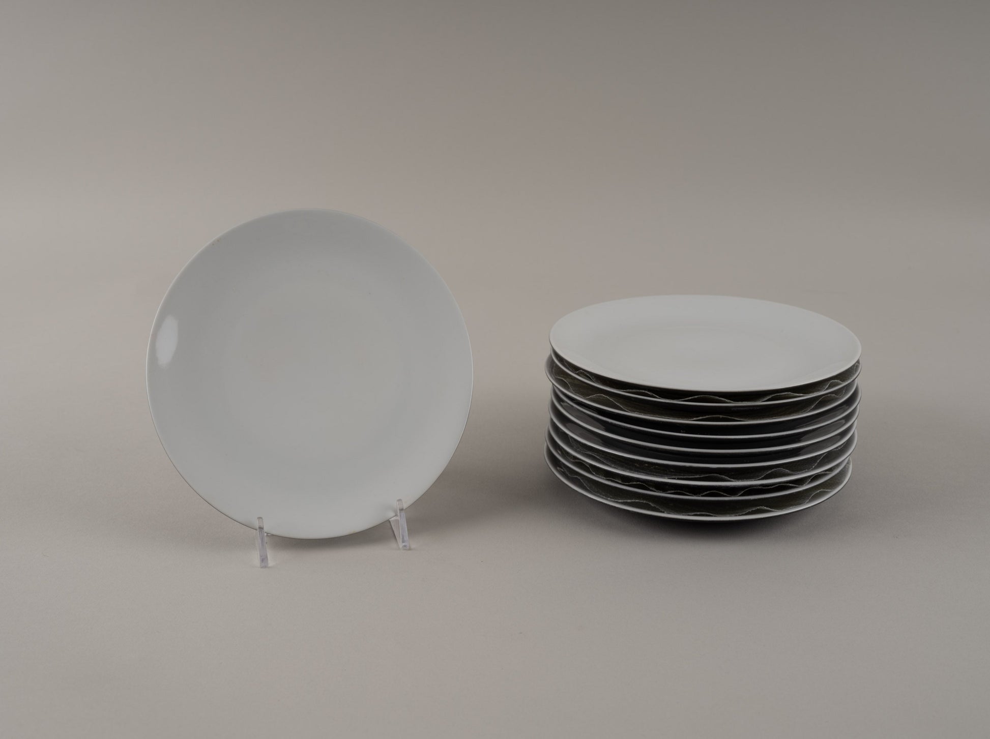 This 82 piece set of "Charcoal" china was designed by Raymond Loewy for Rosenthal in 1952, and manufactured from 1955 through 1965 making it extremely rare. It is an eggshell black, and contrasting gloss white finish. Each piece is marked with the Rosental logo, backstamp "Continental China," designed by Raymond Loewy, and Germany. Additional pieces are included and it is in pristine condition no chips or scratches. The set includes: