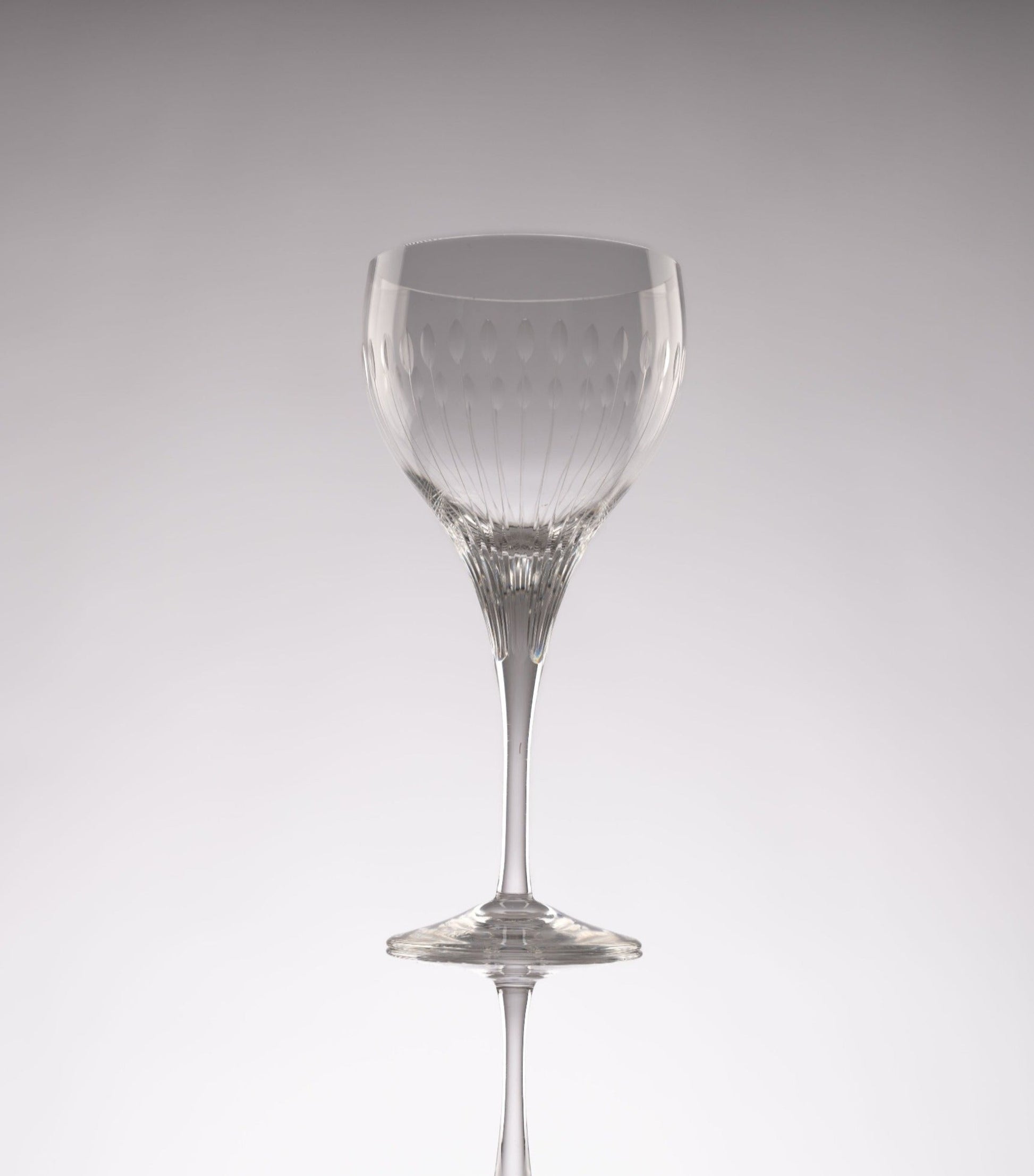 Set of 6 Rosenthal Lotus Cut crystal stemware made during 1963-1965, featuring the now discontinued design. This design is known for its faceted-oval cuts, resembling that of the petal of a lotus flower. The design on the bowl of the stemware then continues onto the stem, where it forms to create a faceted ridge-like texture.