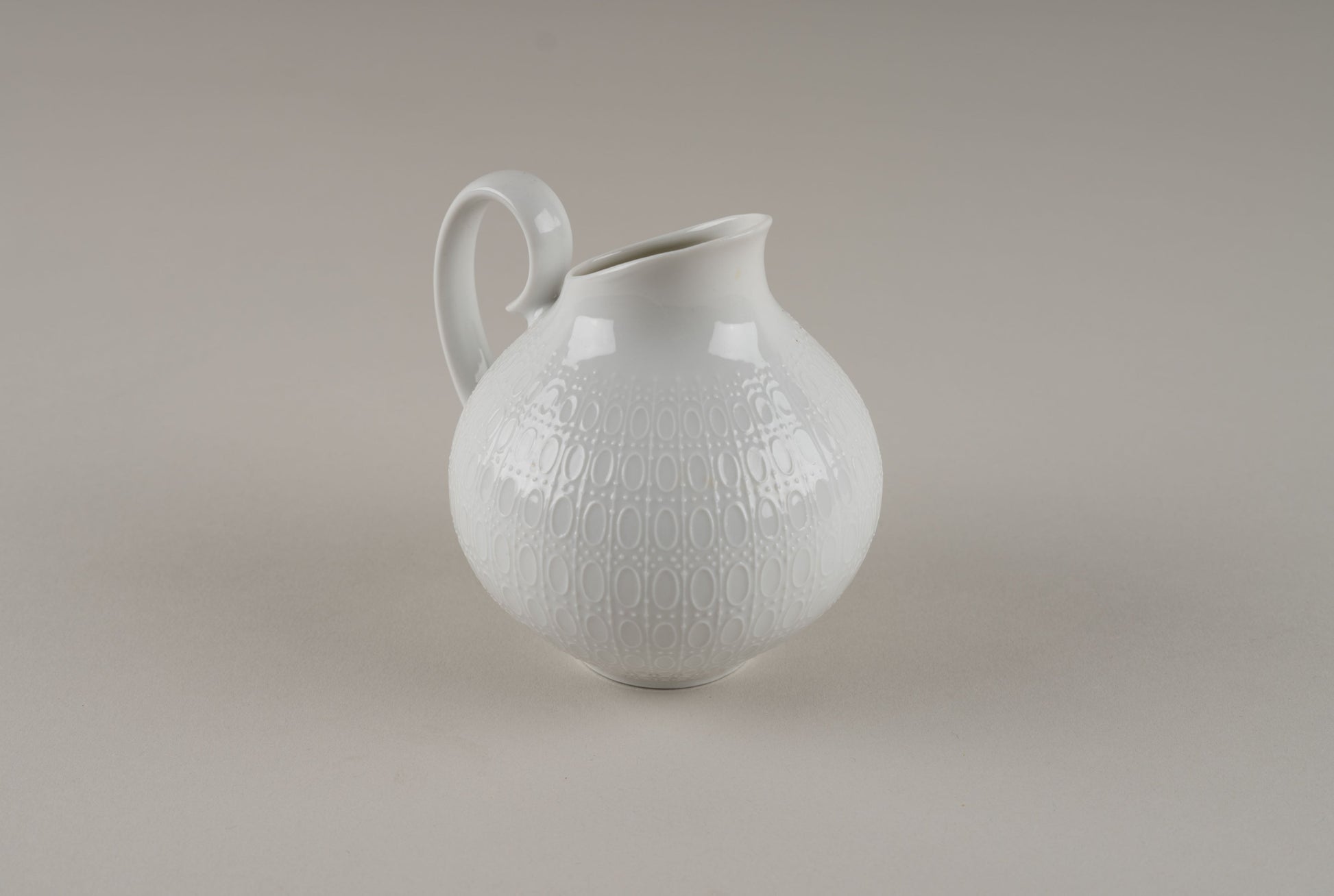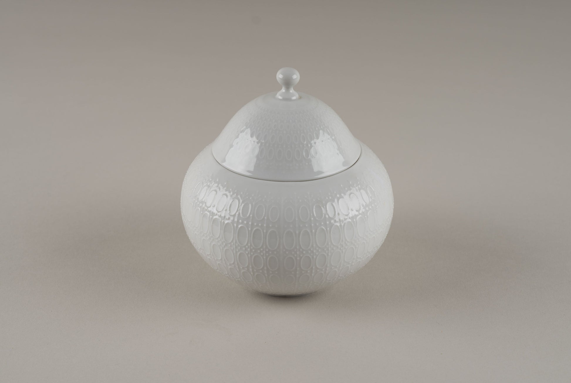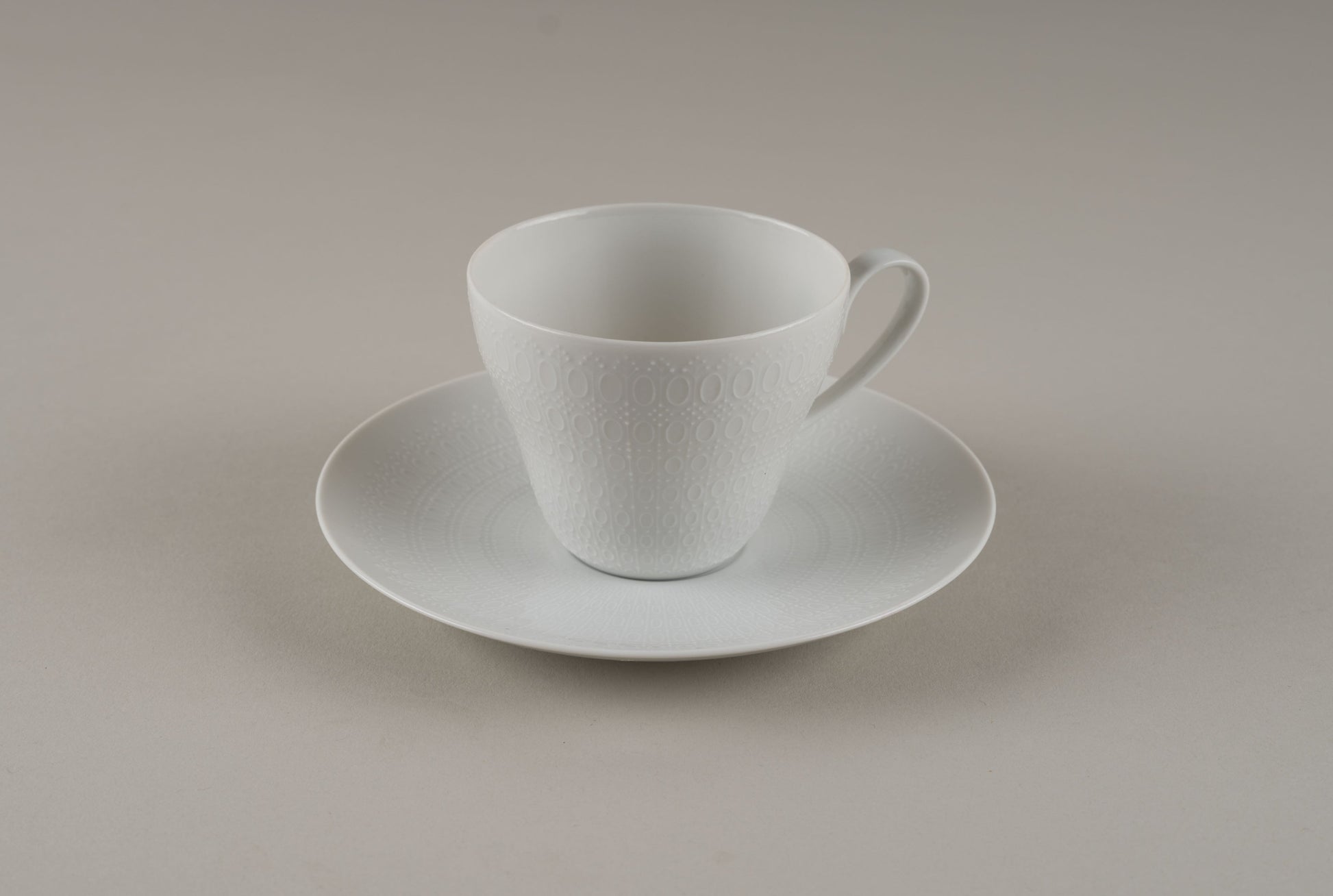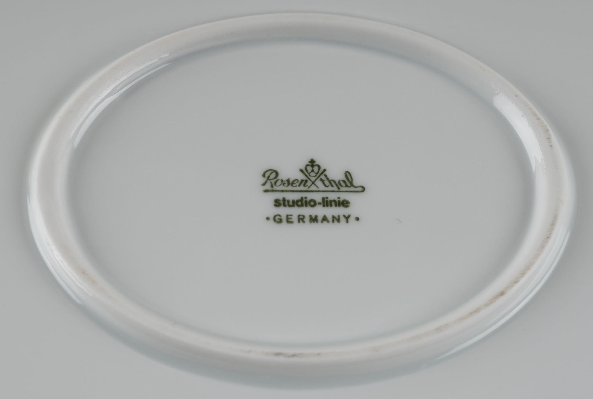 This 66 piece set of "Romance" porcelain china was designed by Bjorn Wiinblad for Rosenthal Studio Line. The "Romance" design features an embossed symmetrical pattern consisting of raised ovals, dots, and lines. Each piece is marked with the Rosenthal logo, the studio-linie logo, Germany, Motif, and Bjorn Winblad signature. All pieces are free of chips and scratches, in excellent condition.