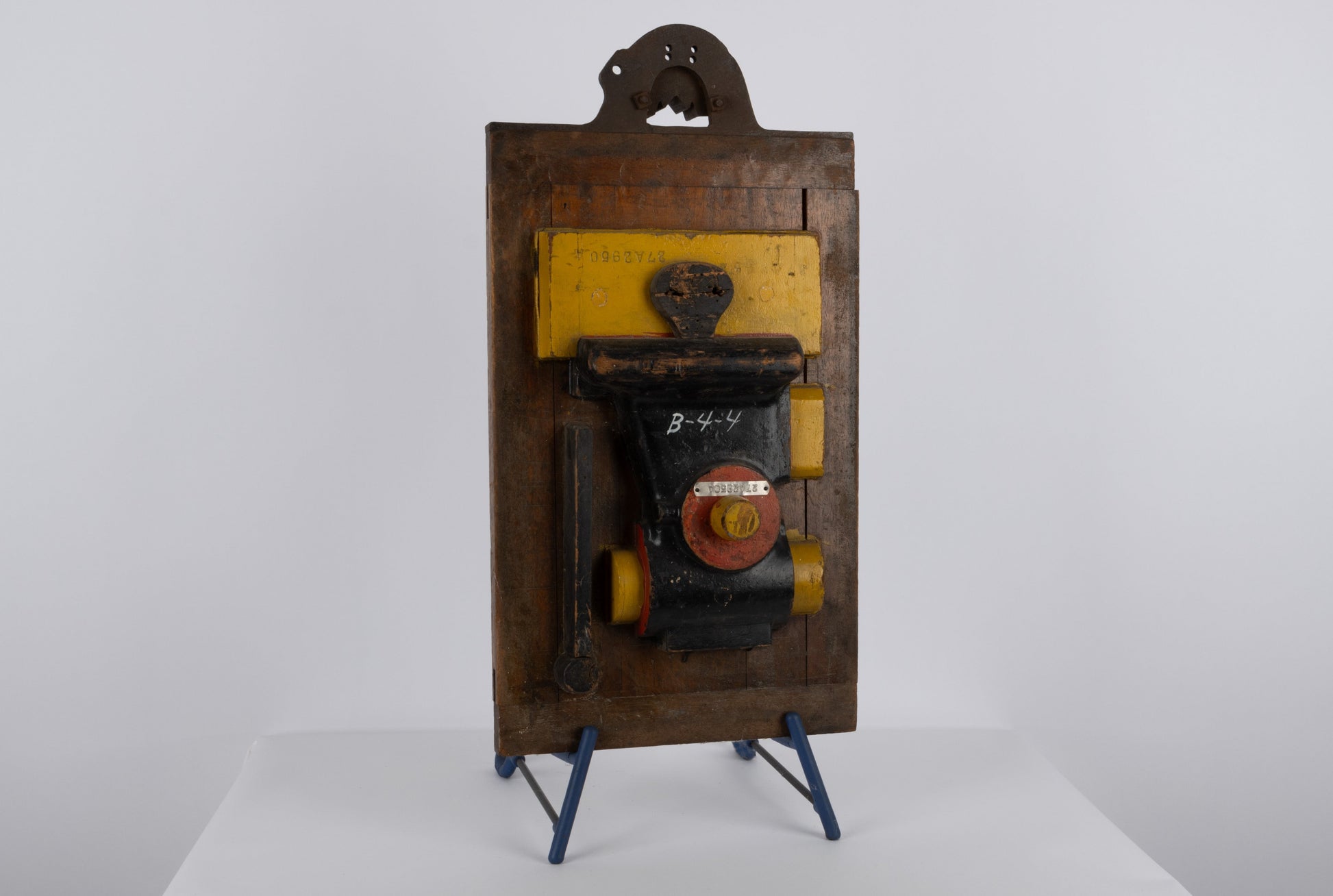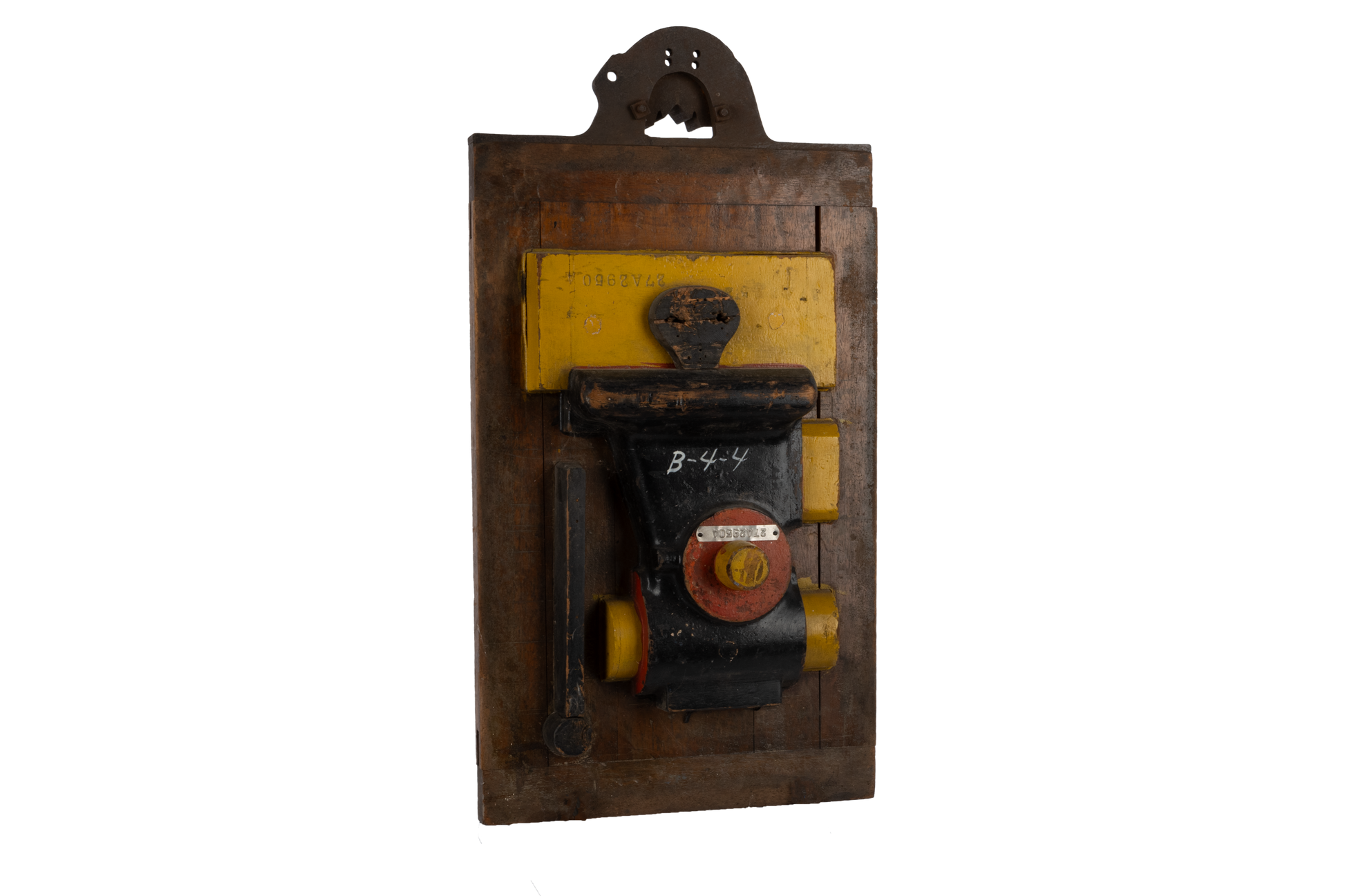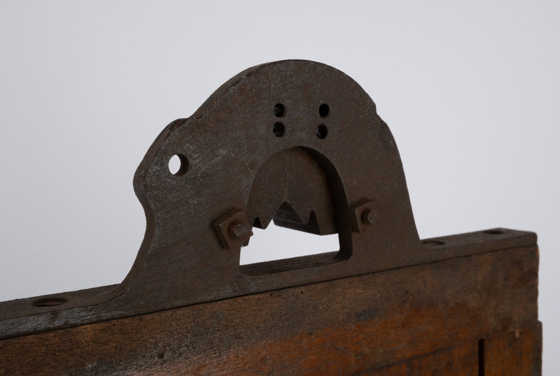 Two sided wooden industrial machine mold with metal handle. This piece has the perfect patination, featuring vibrant colors. On a stand or on a wall it is fabulous piece of art. Stand not included.