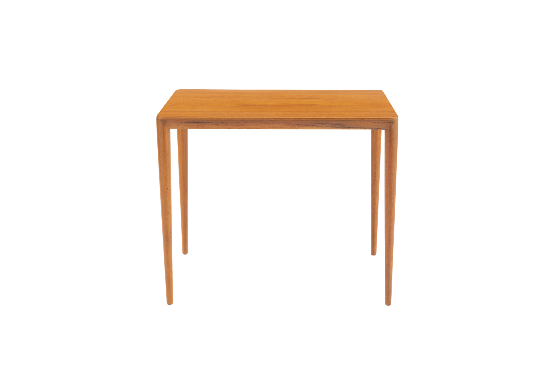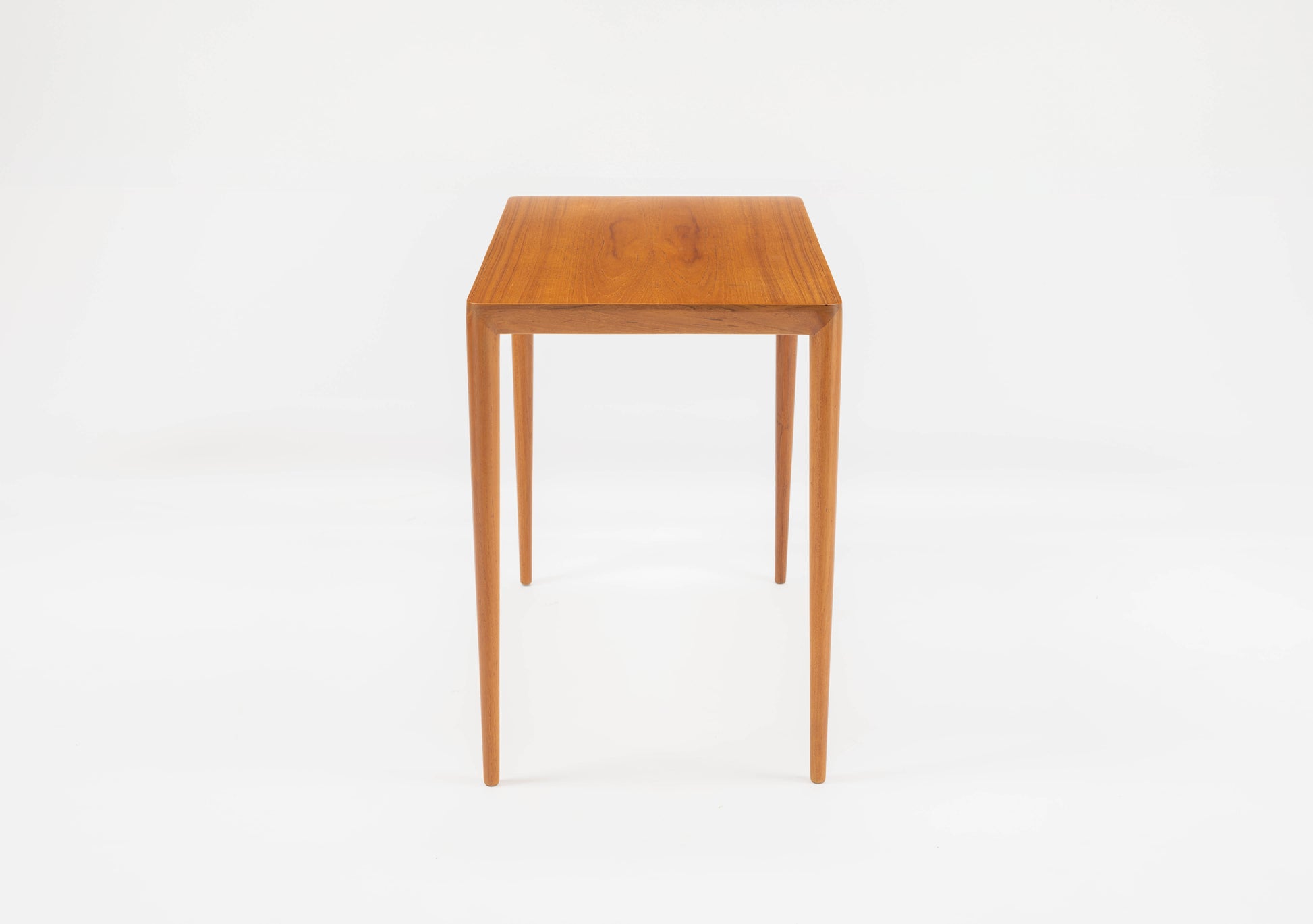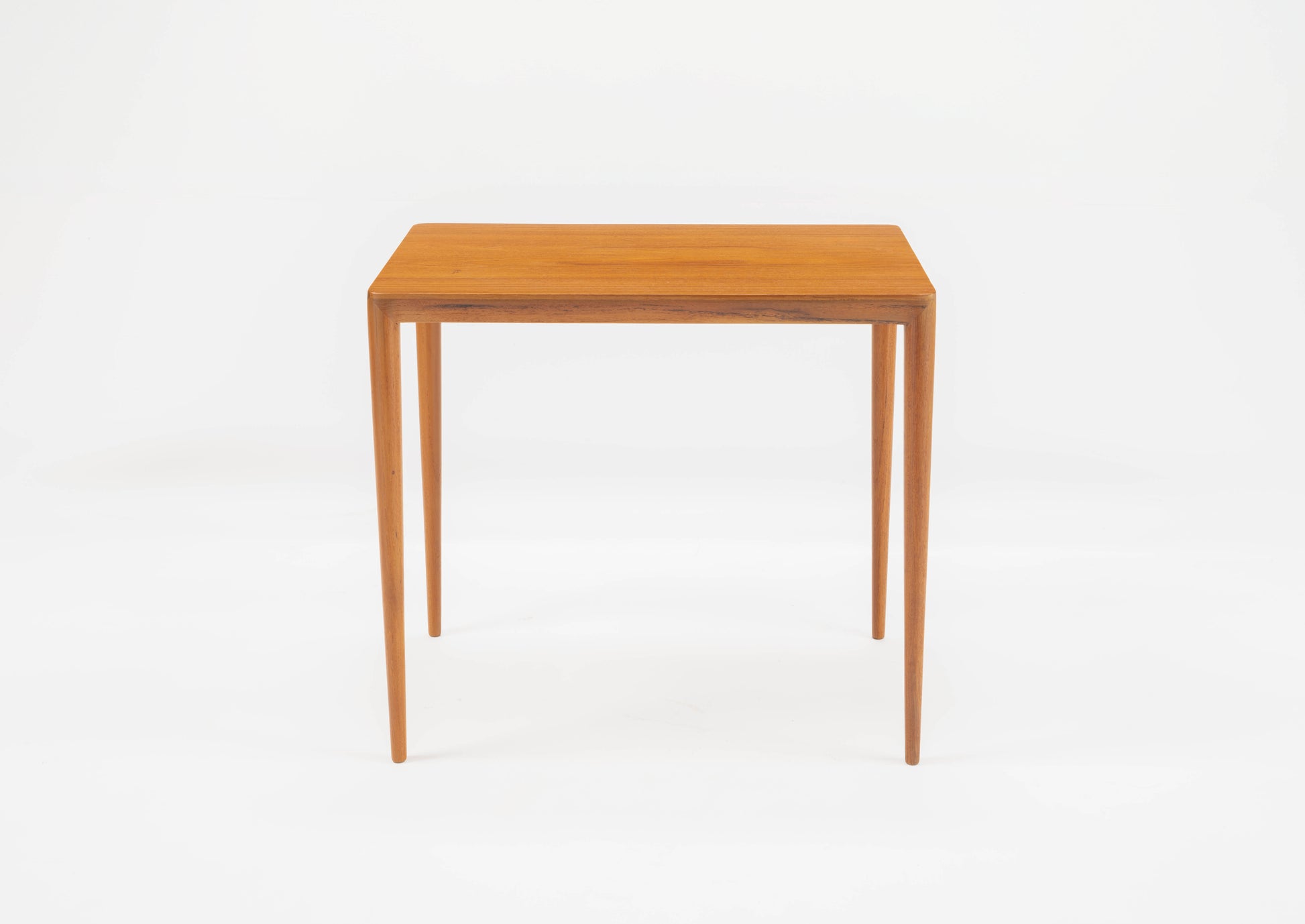 Beautiful teak side table in the manner of Severin Hansen circa 1960s. Features subtle, beveled sides which seamlessly conjoin with the round, tapered legs. Marked "88" on the underside.