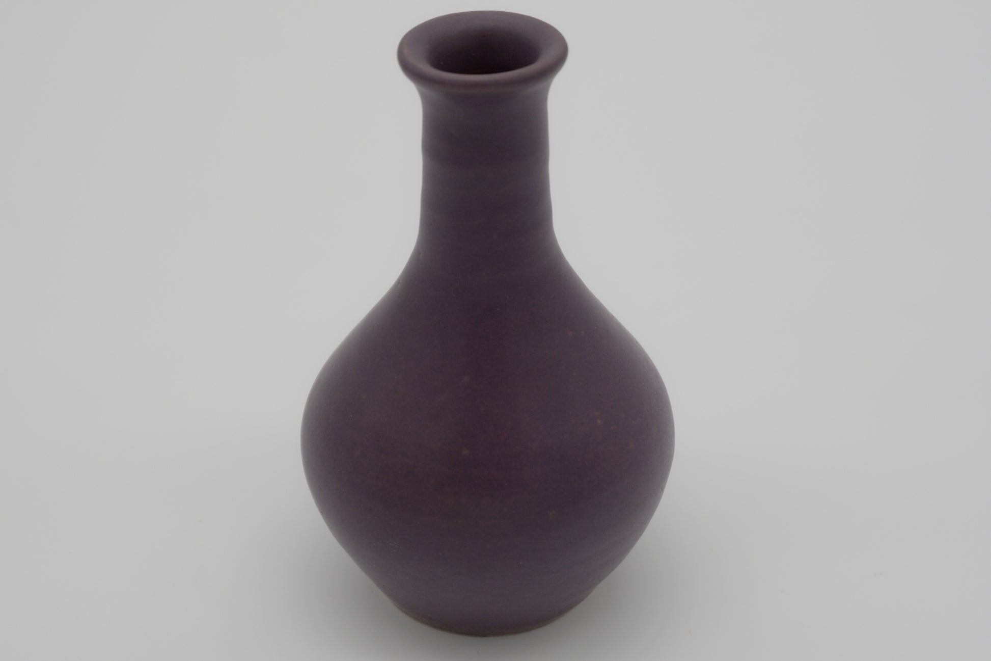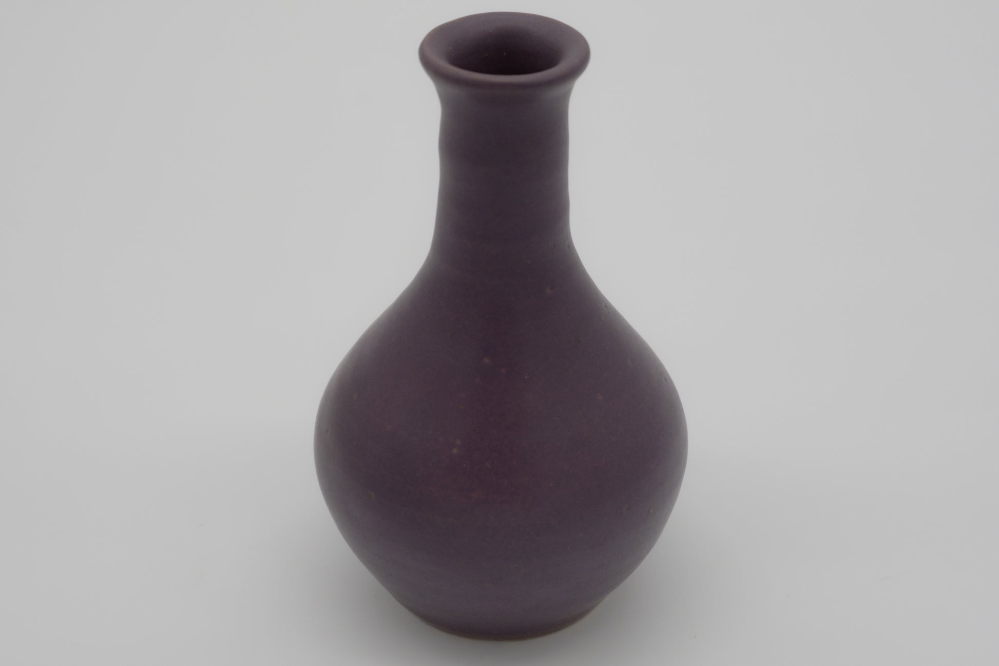Purple glazed pottery vase with a center choke and a semi-cylindrical neck. Marked on the bottom but only partially legible.