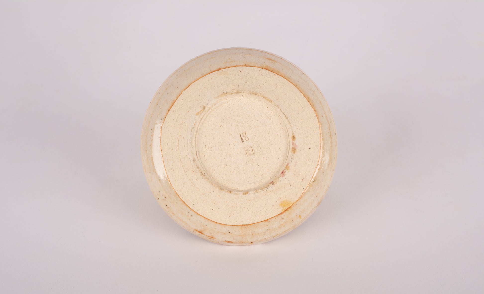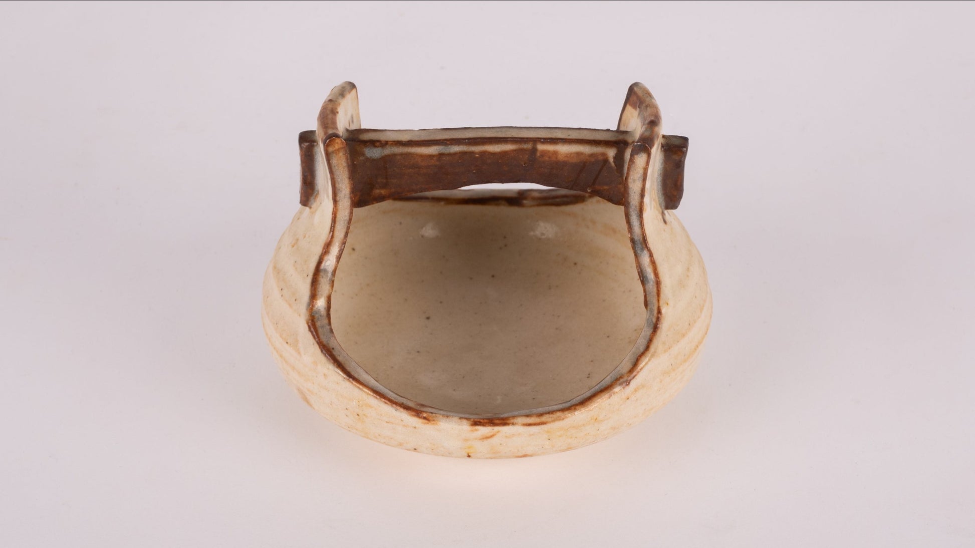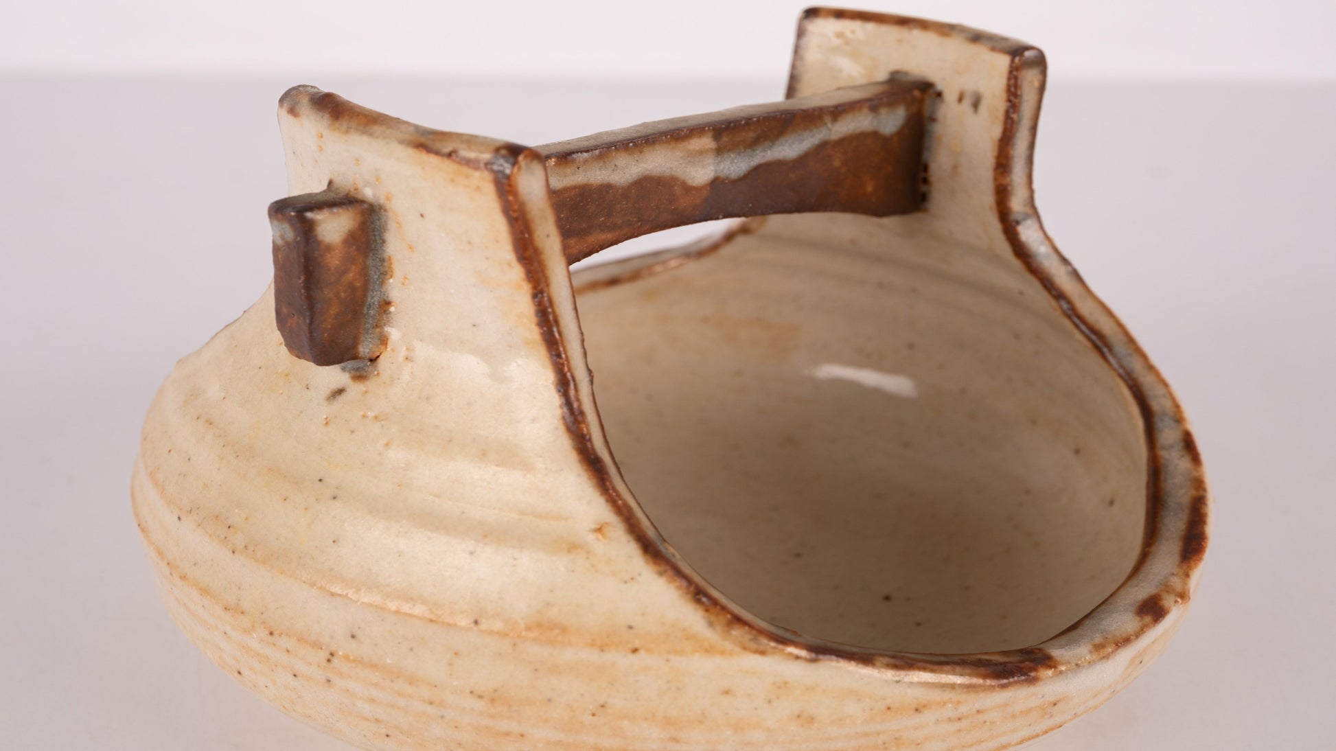 Small pottery bowl with handle. Stamped signature/seal on the bottom.