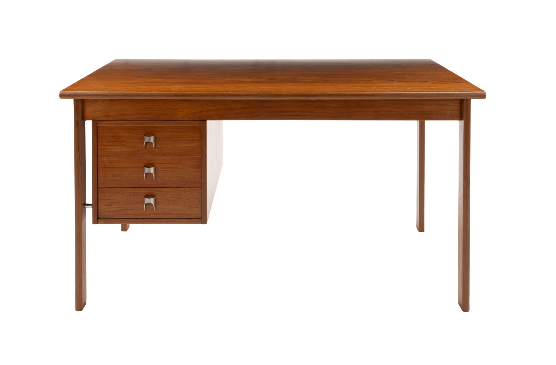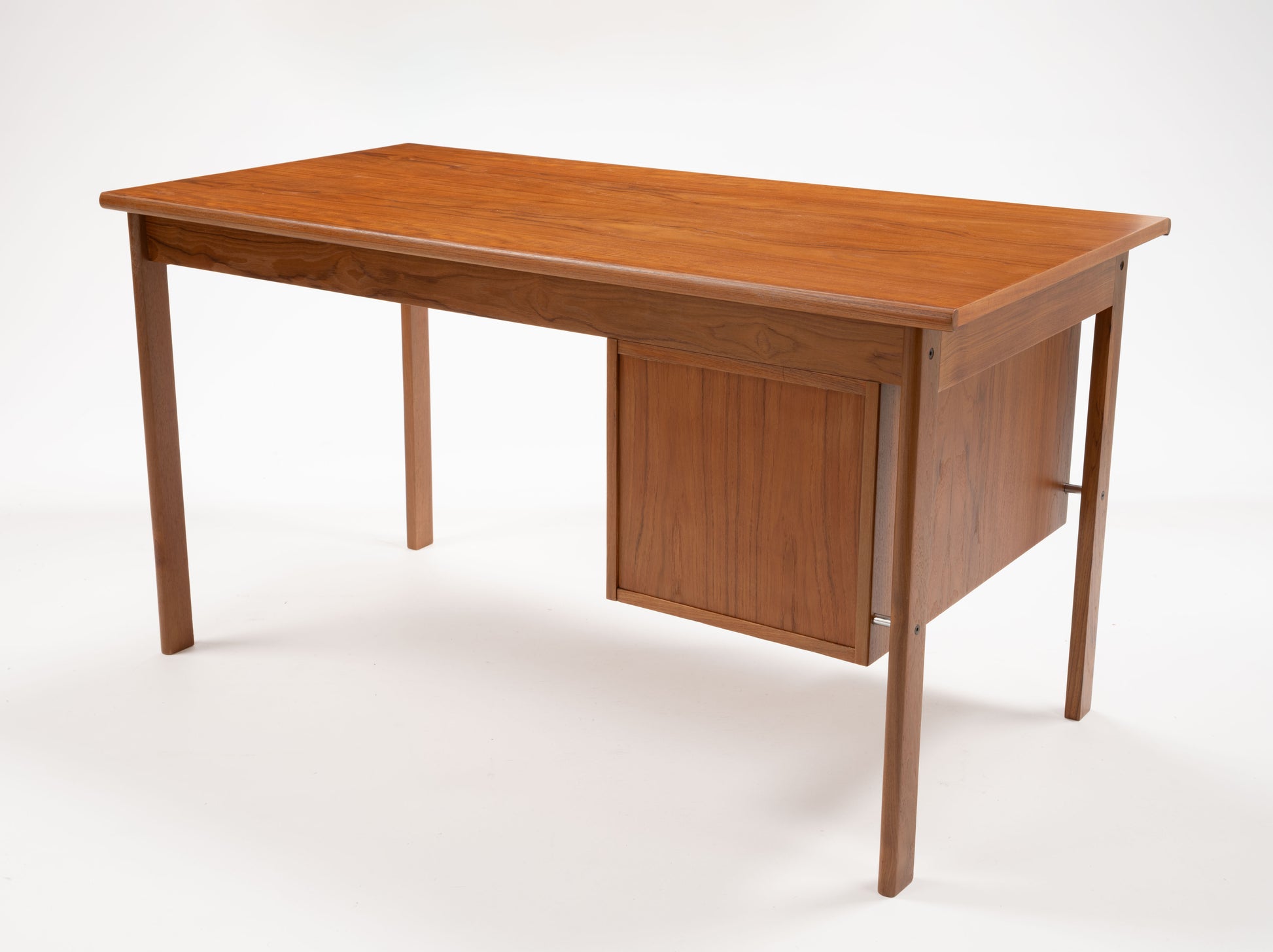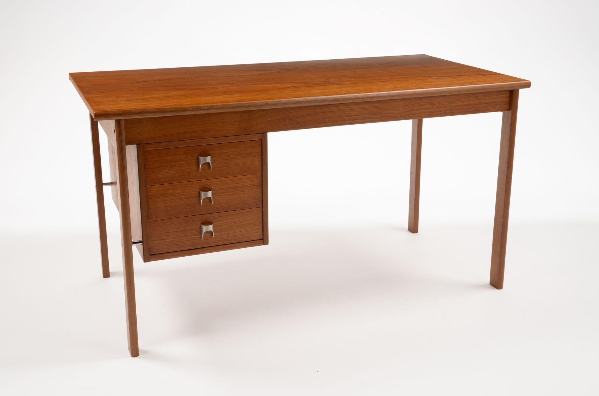 Teak writing desk designed by Peter Loving Nielsen, featuring a sliding top to reveal two hidden compartments. Three convenient drawers for storage with beautifully sculpted handles in stainless steel. A solid piece of mid-century modern Danish design.